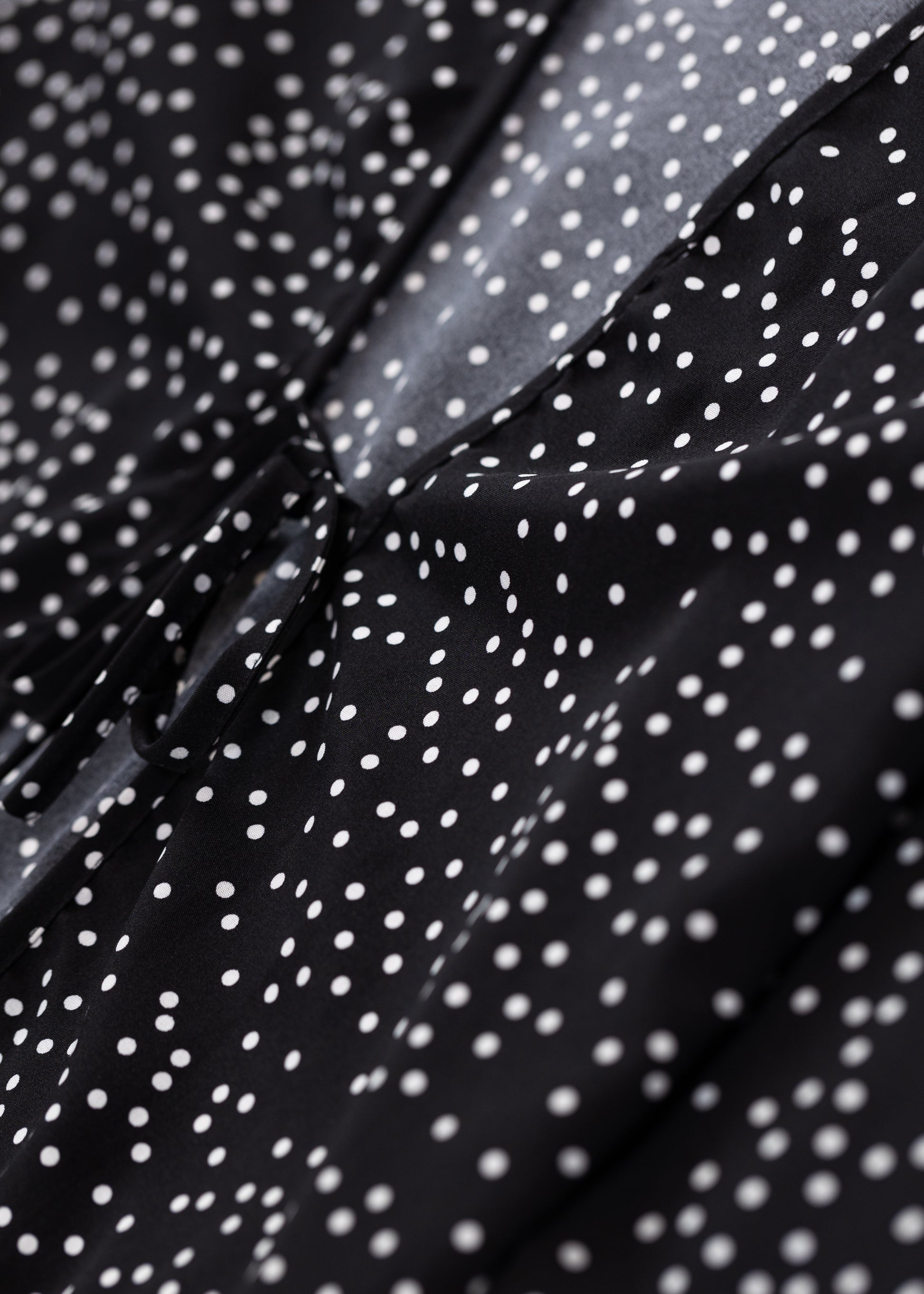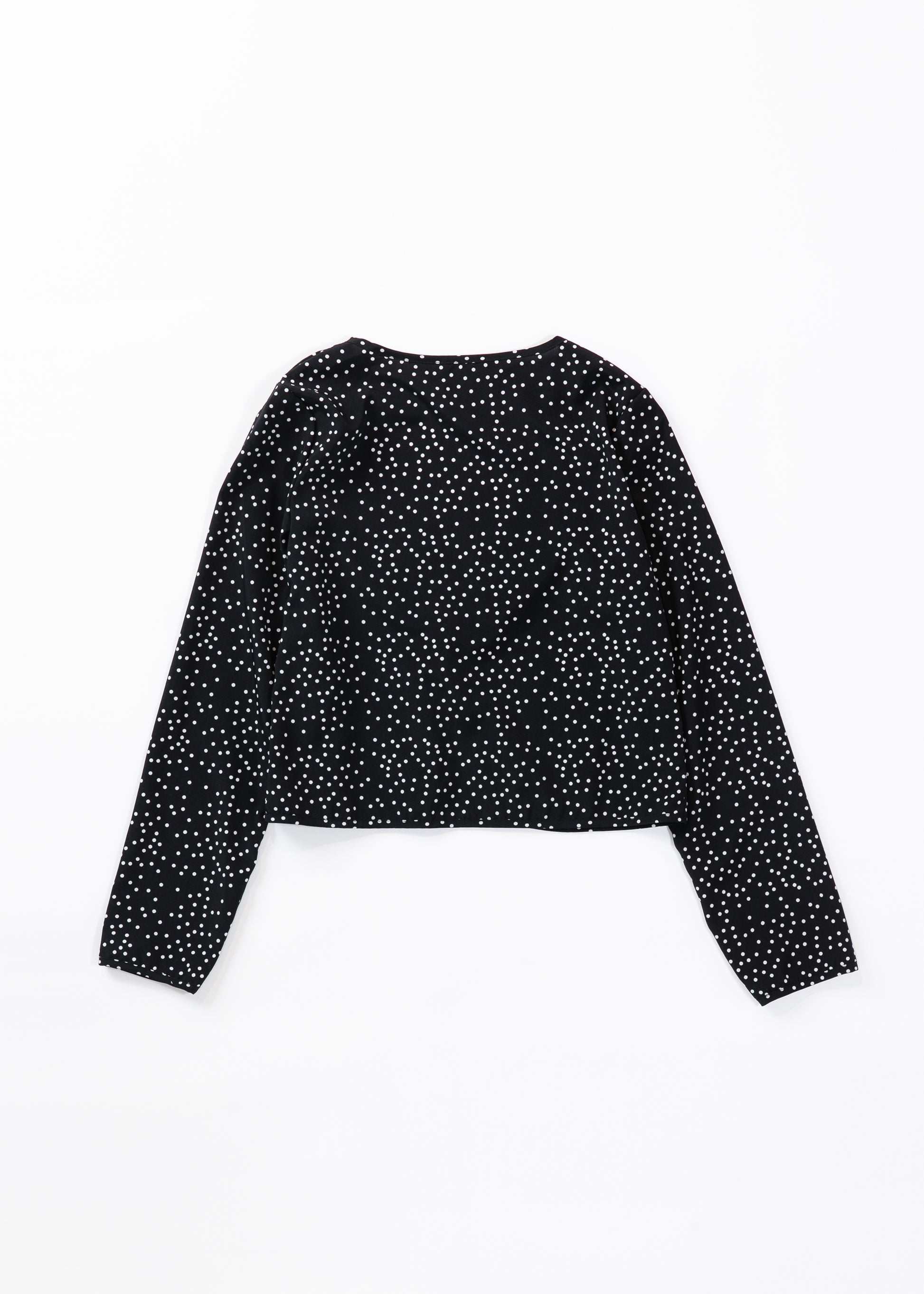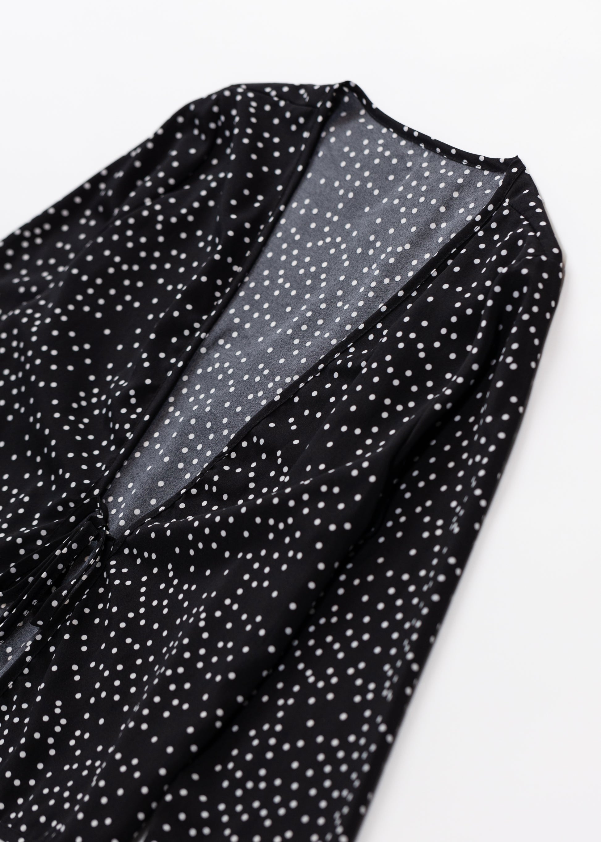 This summer cardigan has a small polka dot pattern and ties with a ribbon at the front.