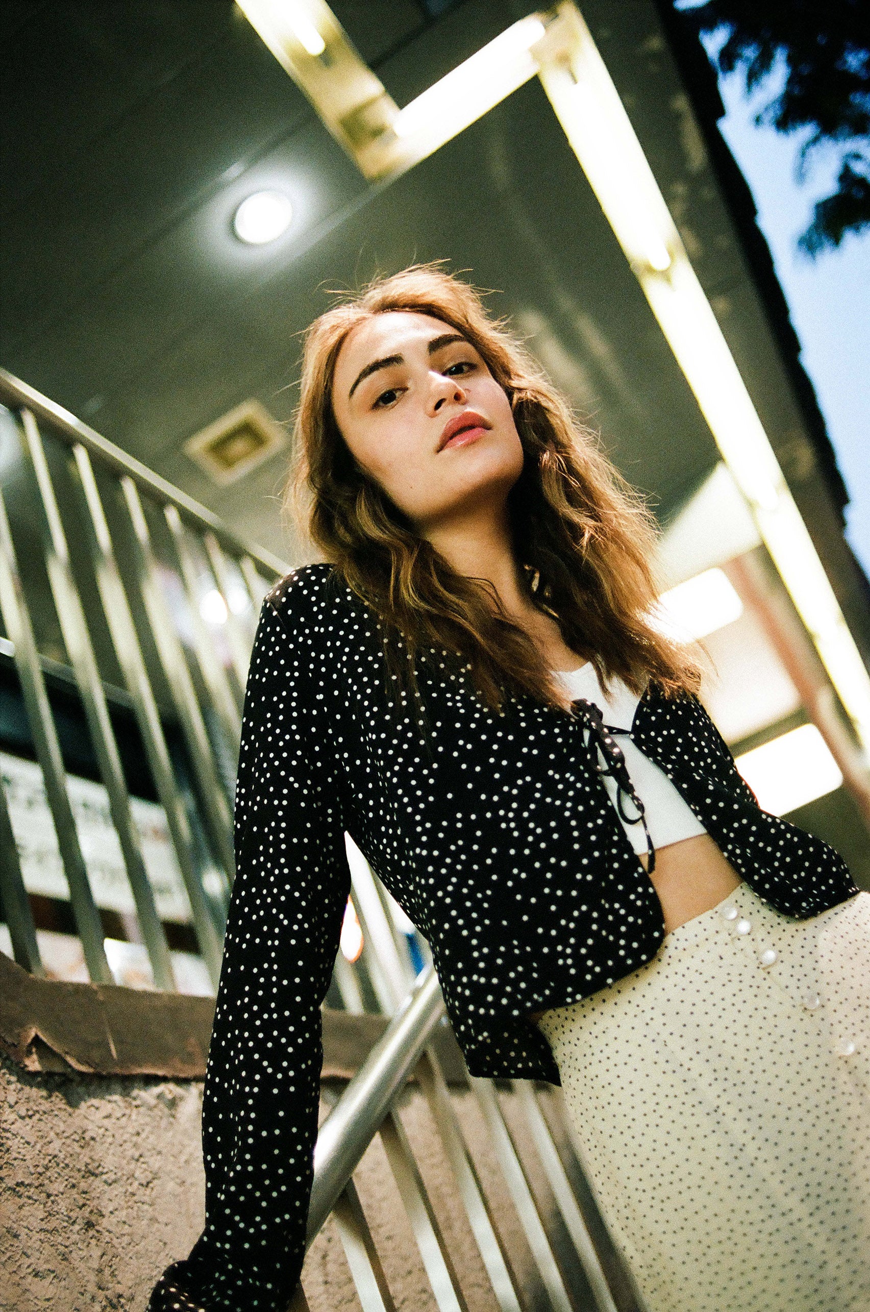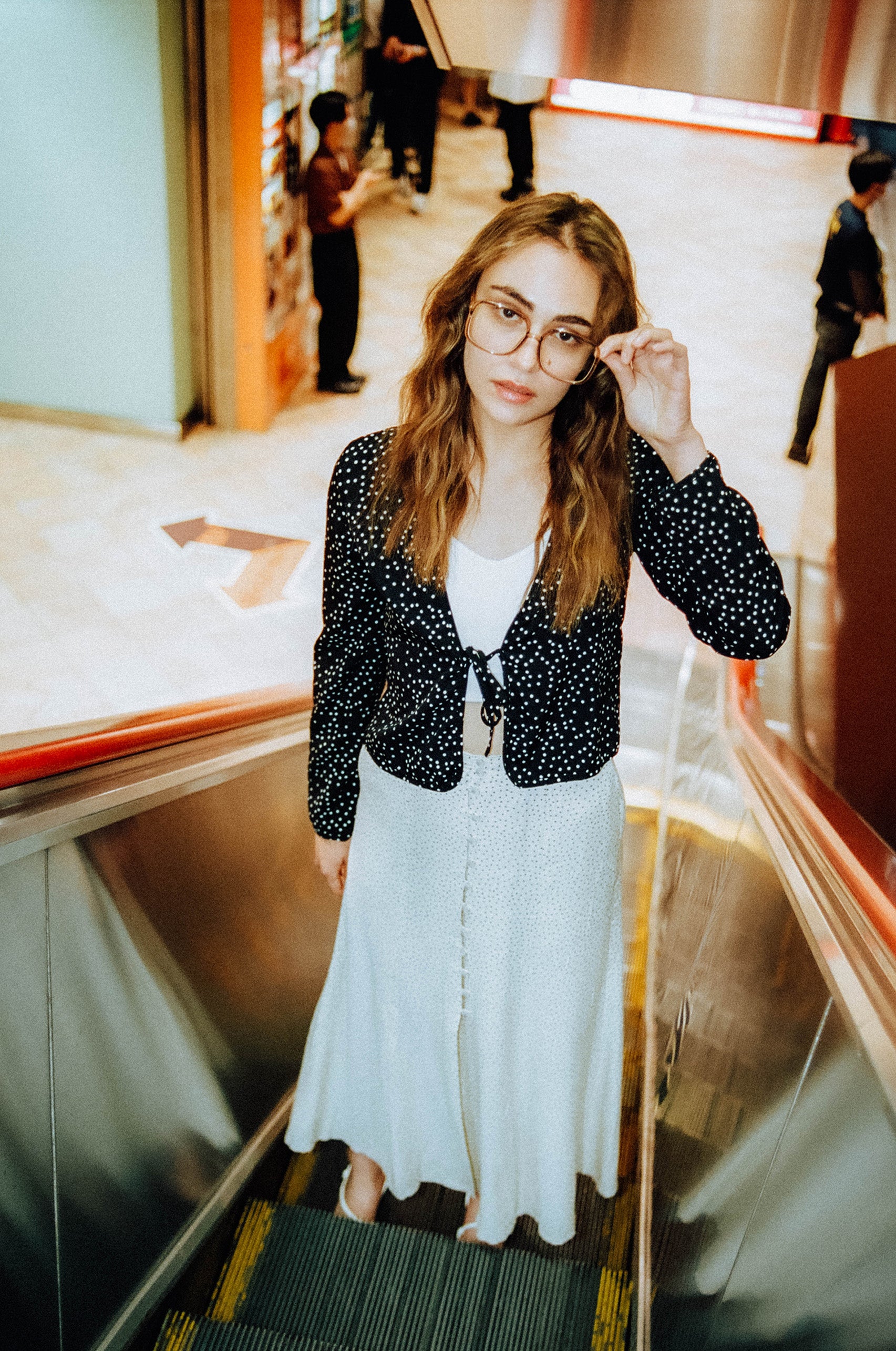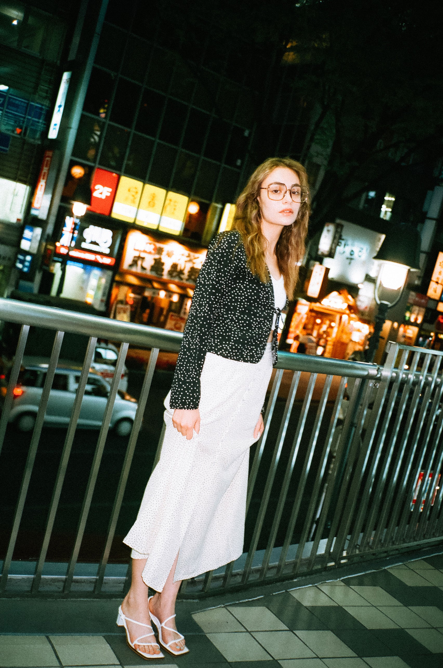 This summer cardigan has a small polka dot pattern and ties with a ribbon at the front.