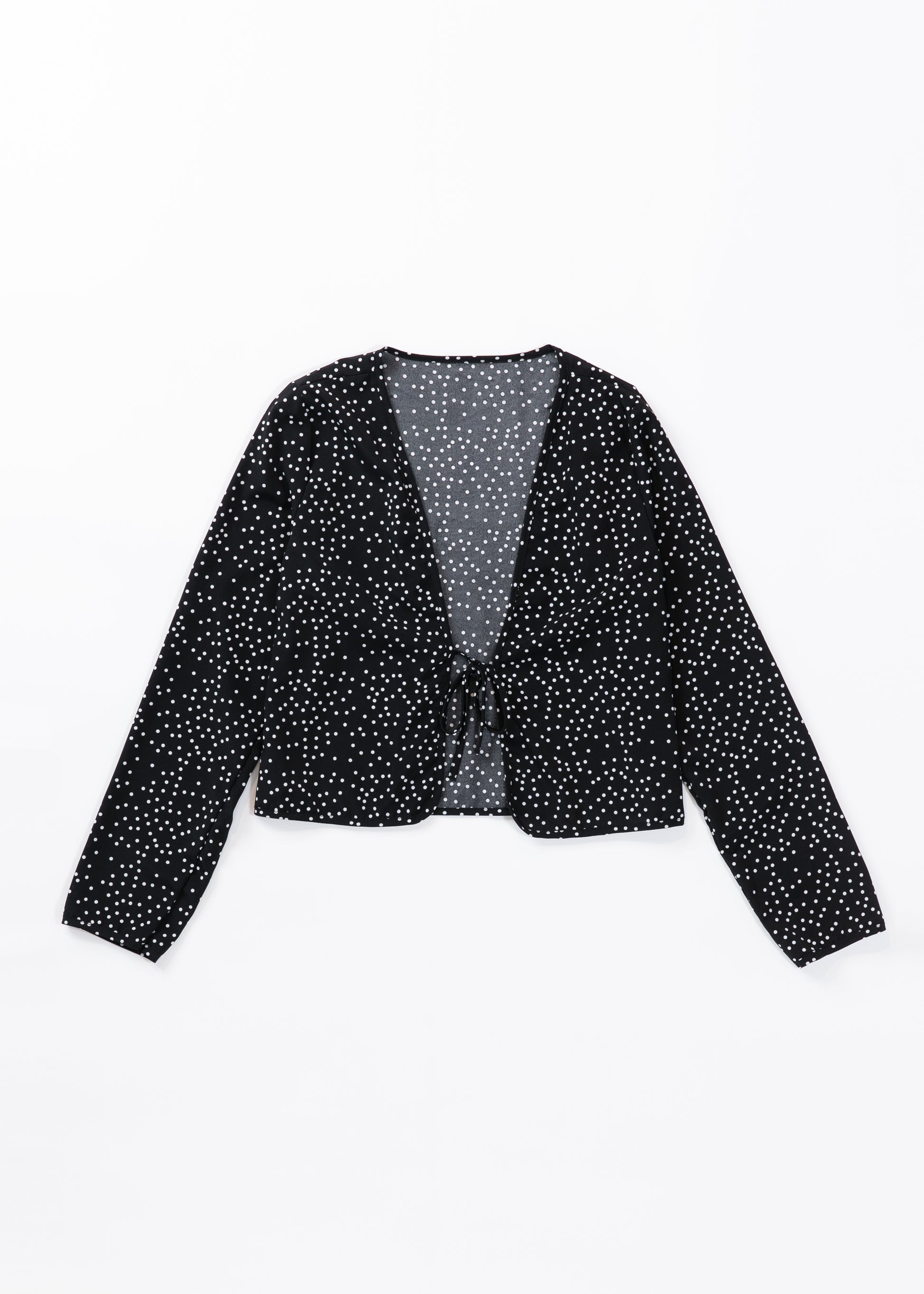 This is a summer style cardigan with front ribbon tie and made of pinndotted material.
