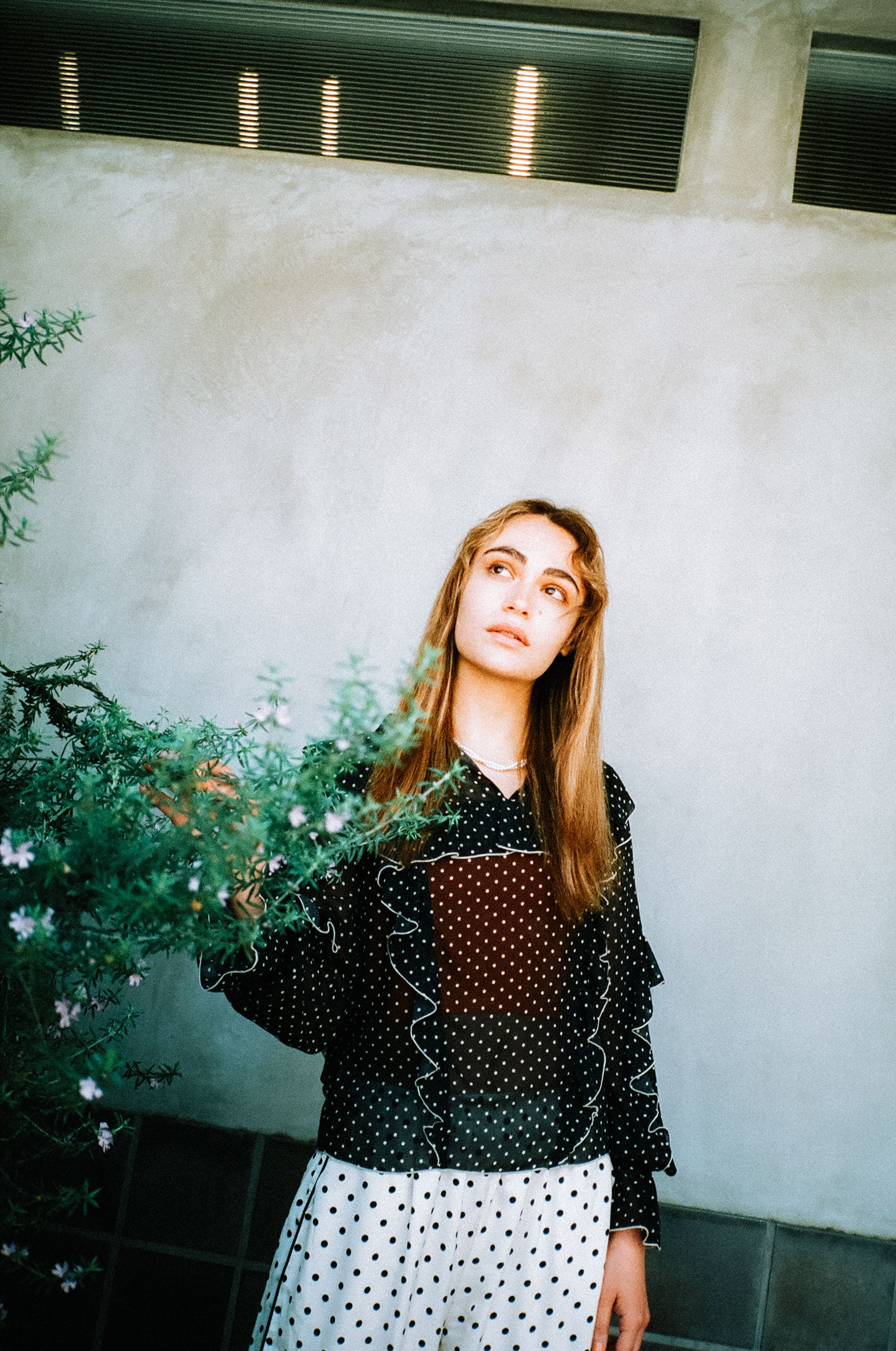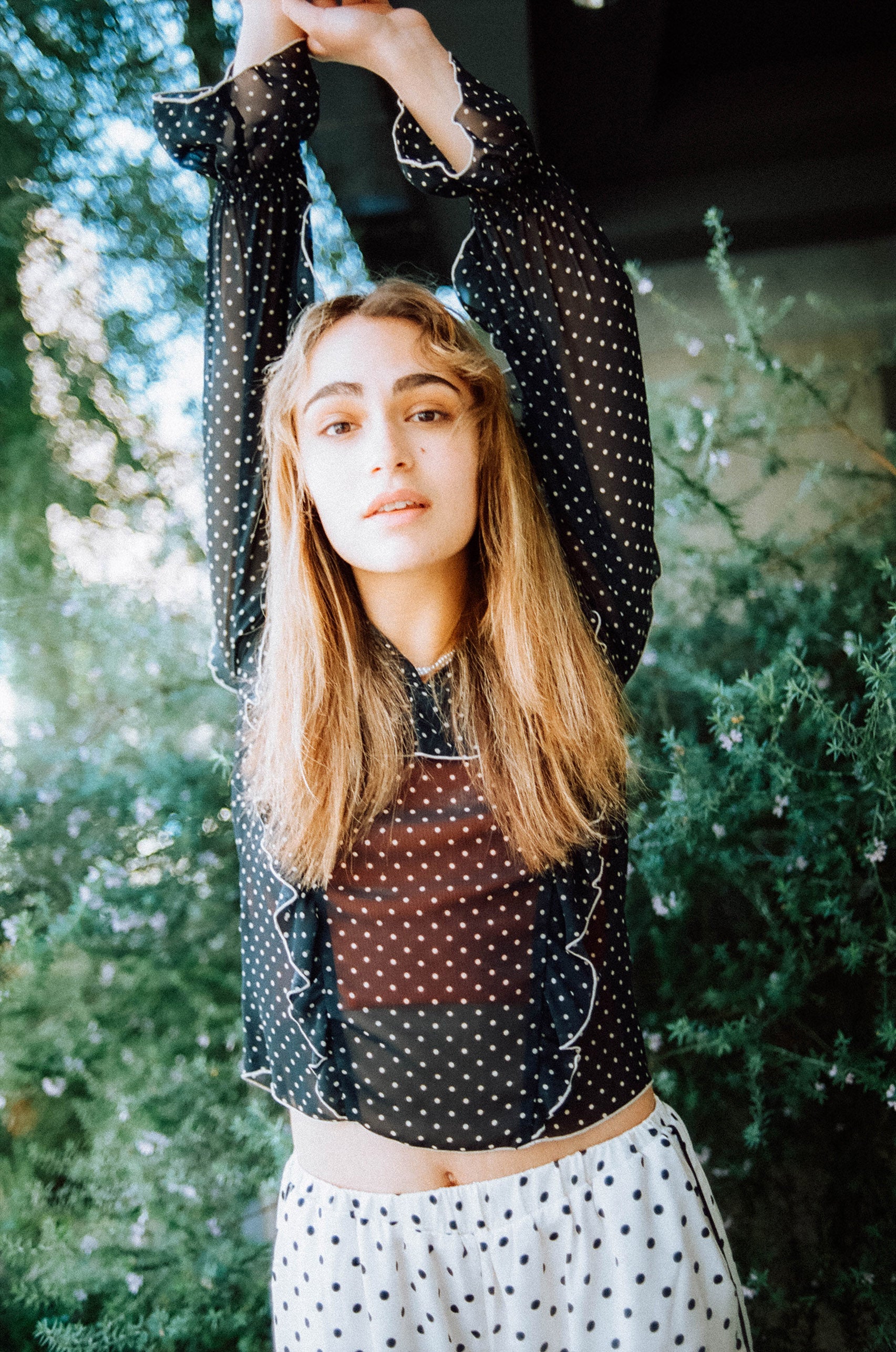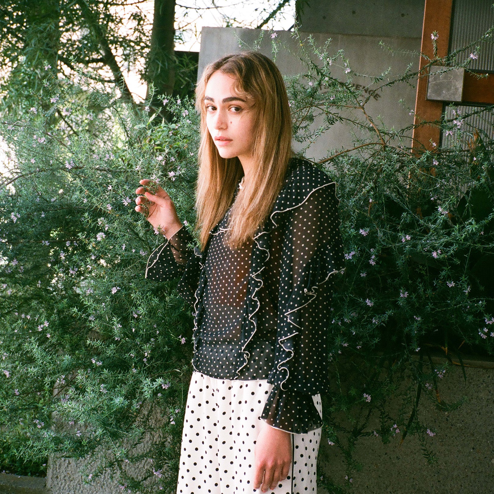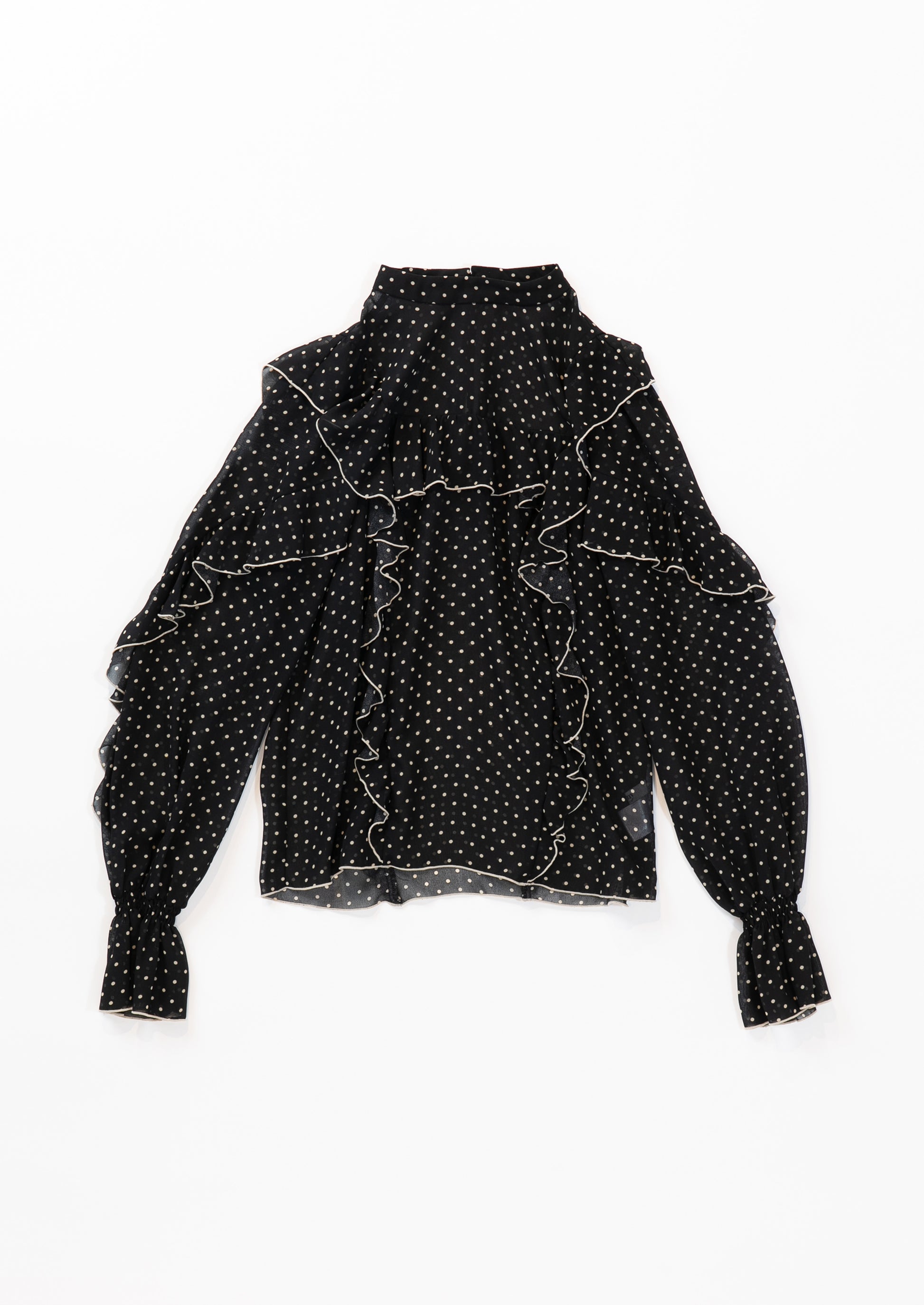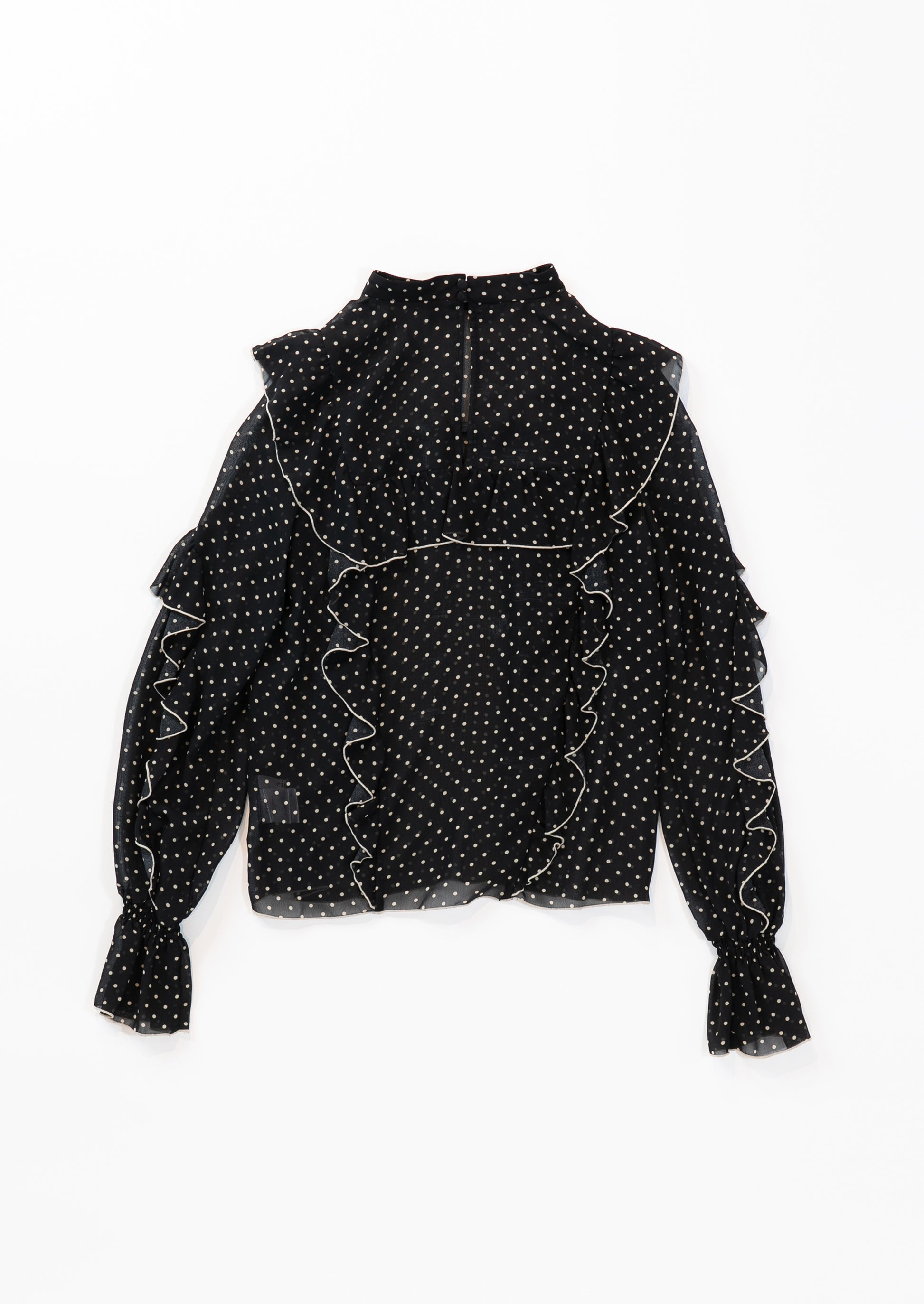 Sheer long blouse with ruffles at the front and sleeves, which made of black fabric with tiny beige dots.