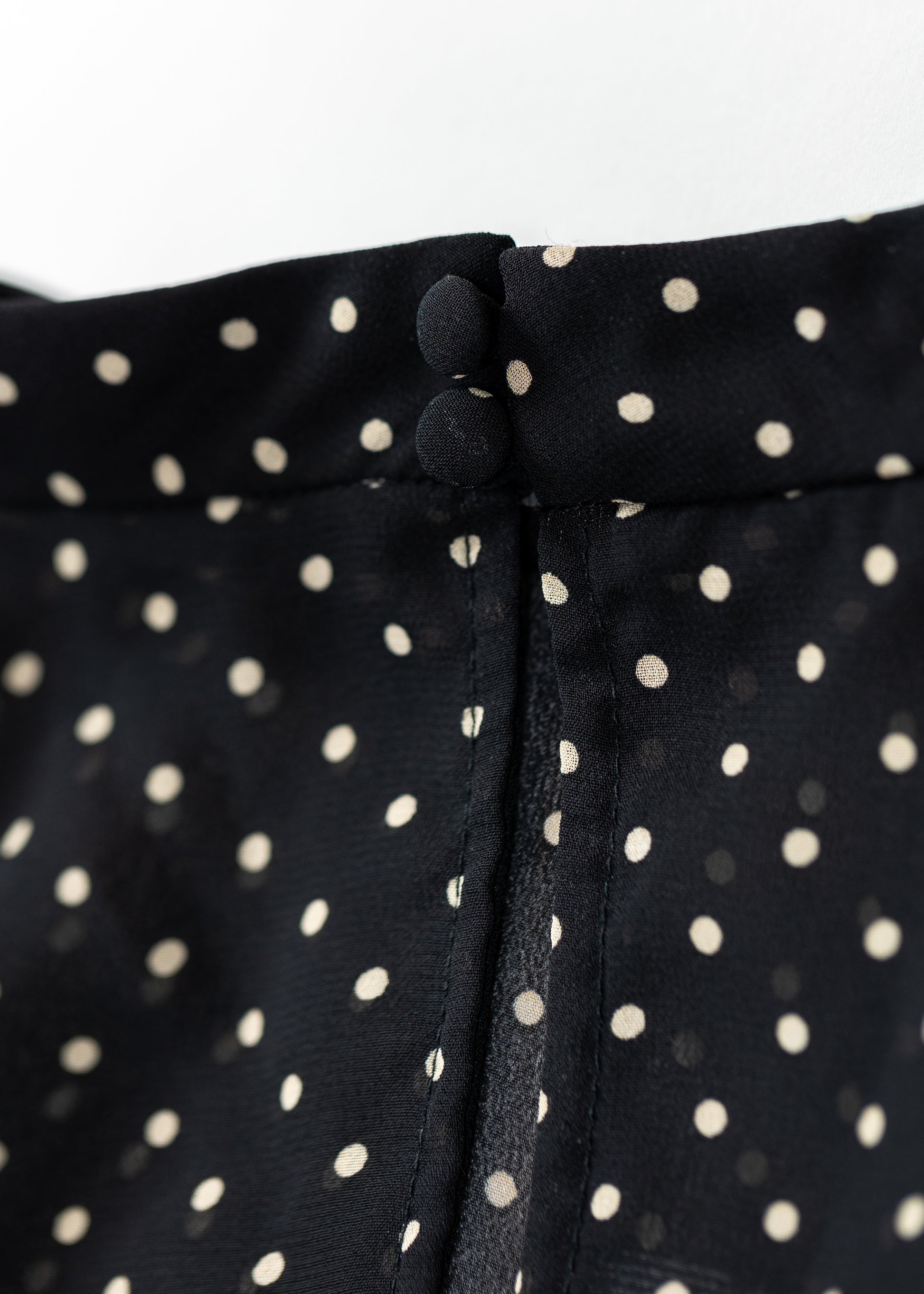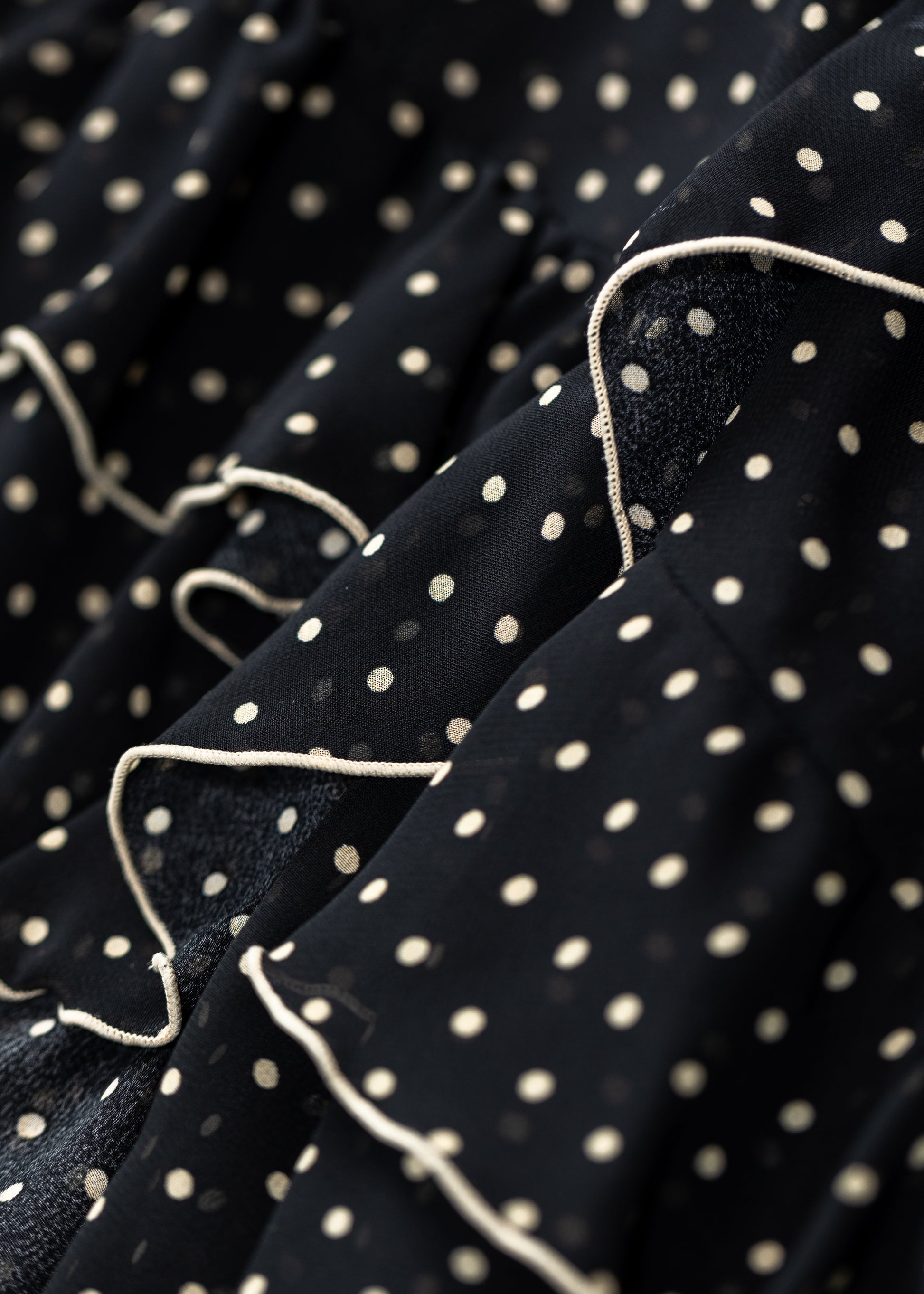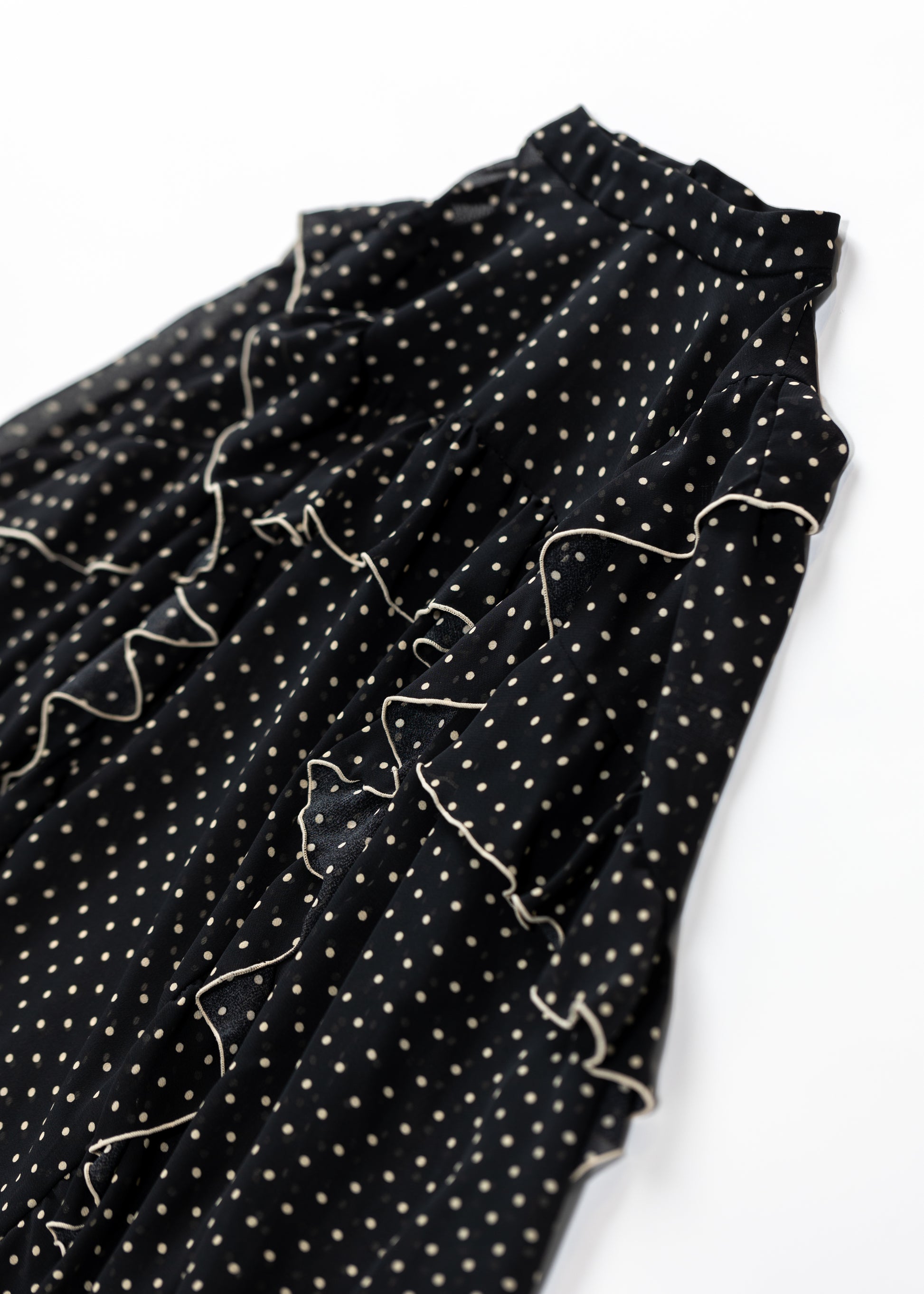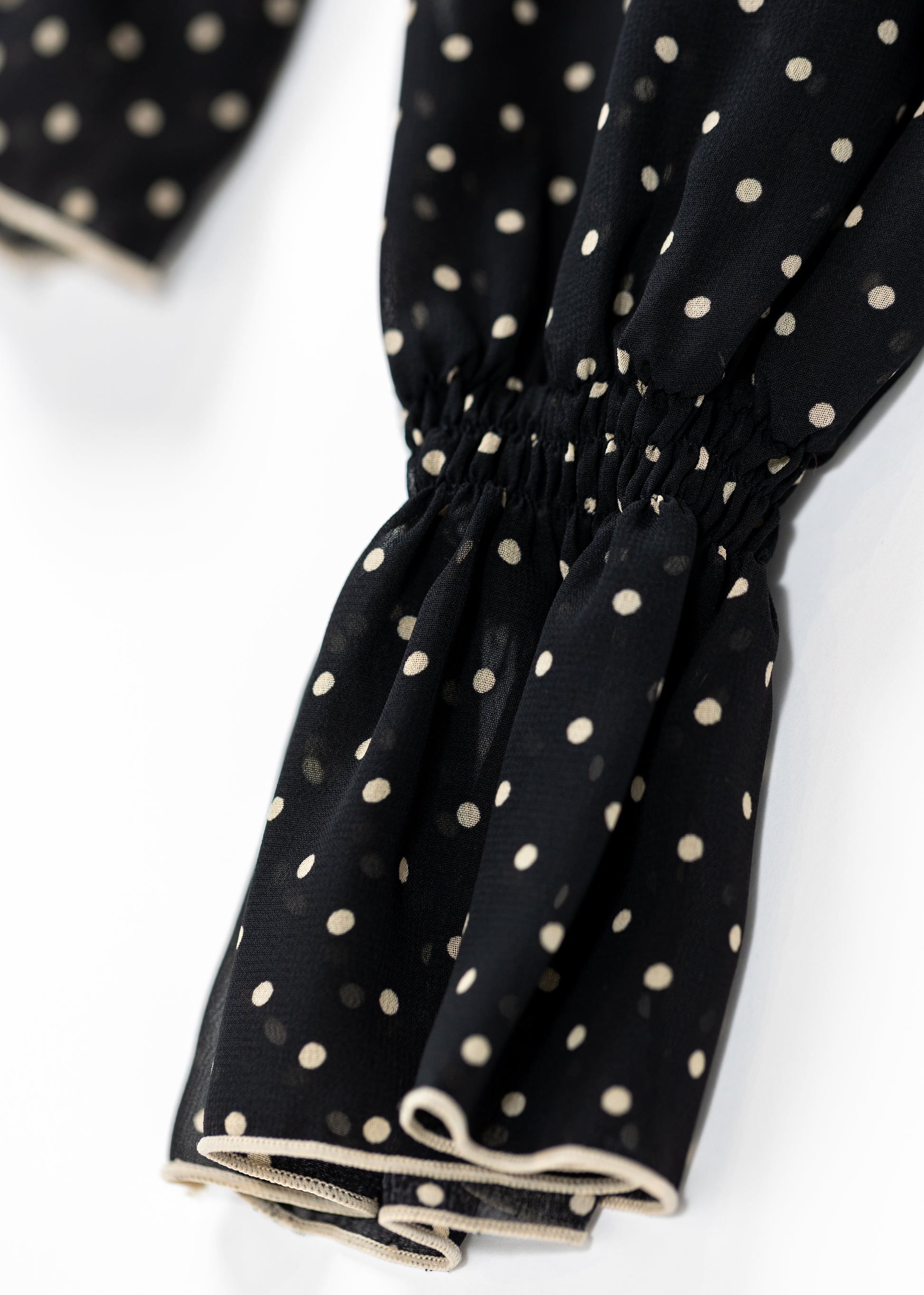 This is a seal-through long blouse with a small beige polka dot pattern on a black background and ruffles on the front and sleeves.