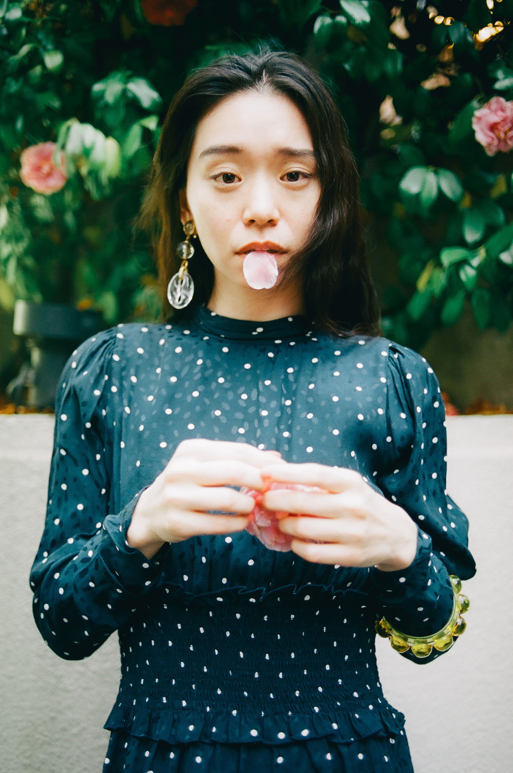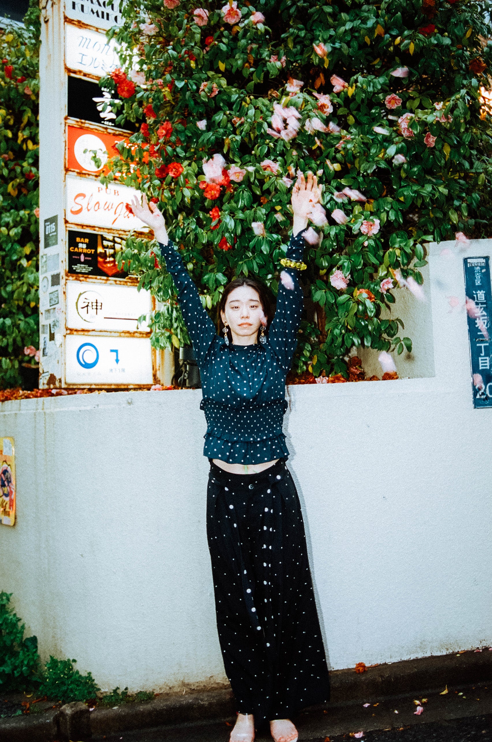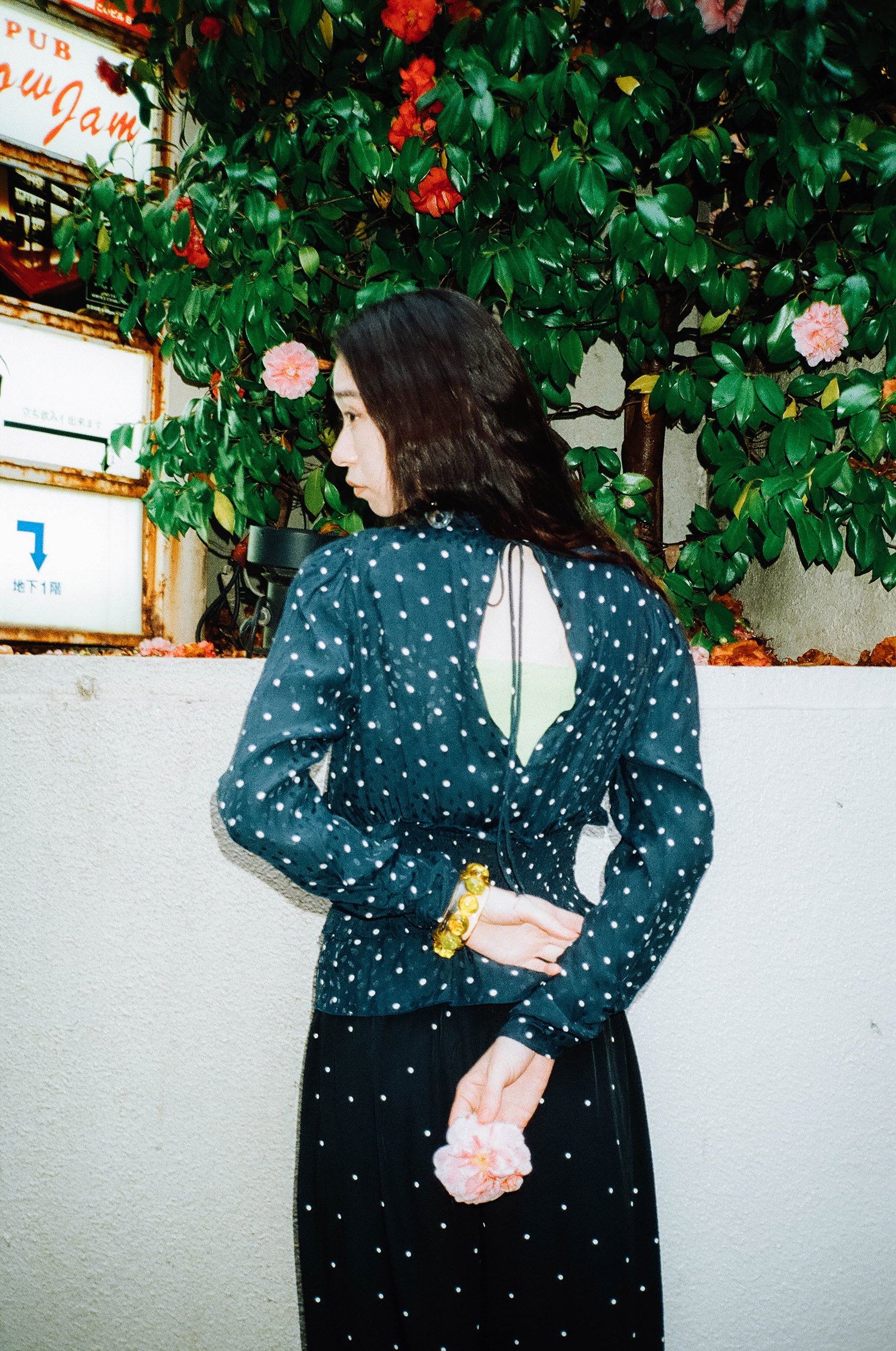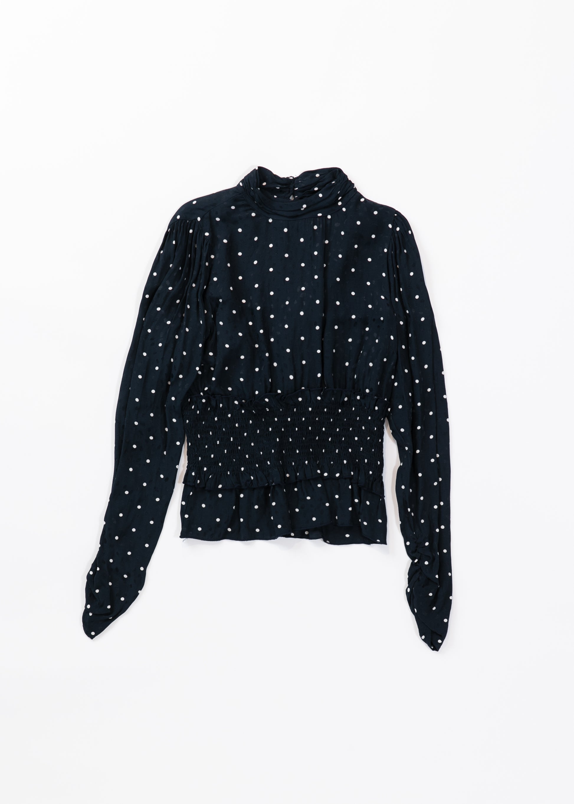 This elegant long blouse features a small white polka dot pattern on a navy blue background, a wide opening in the back, and a gathered ruffle design at the waist.