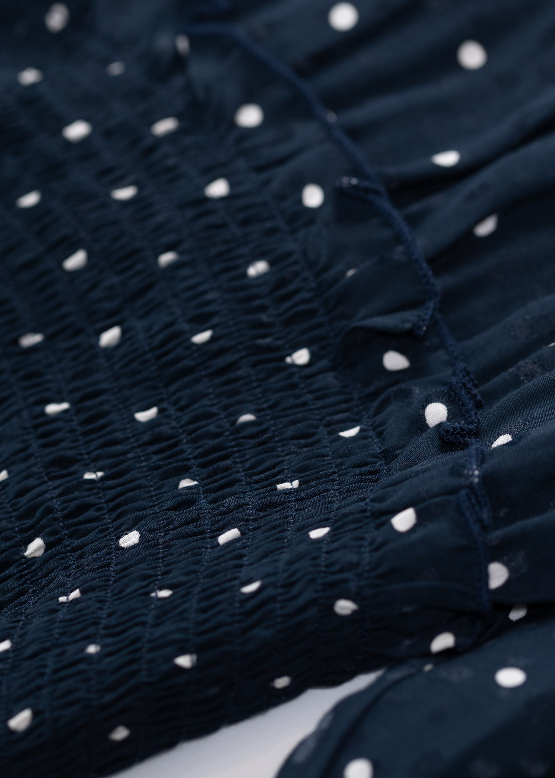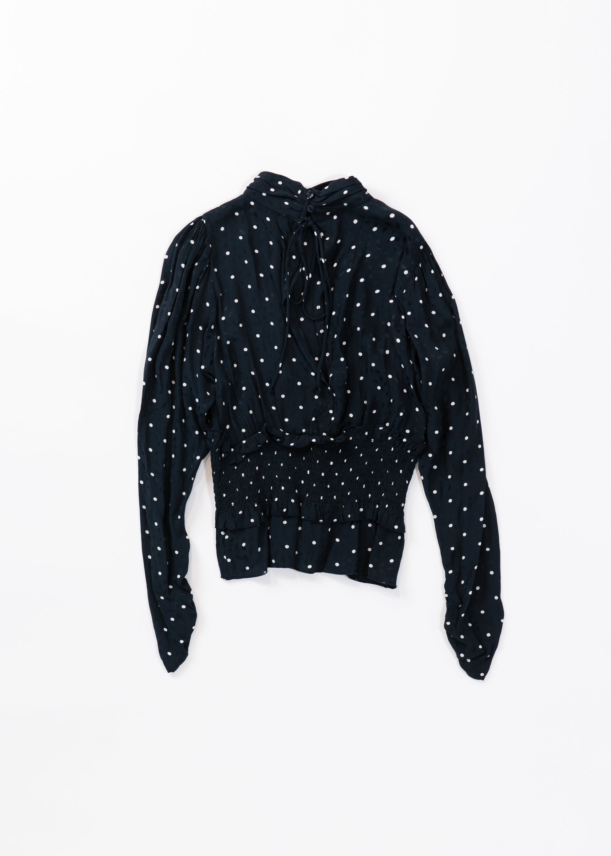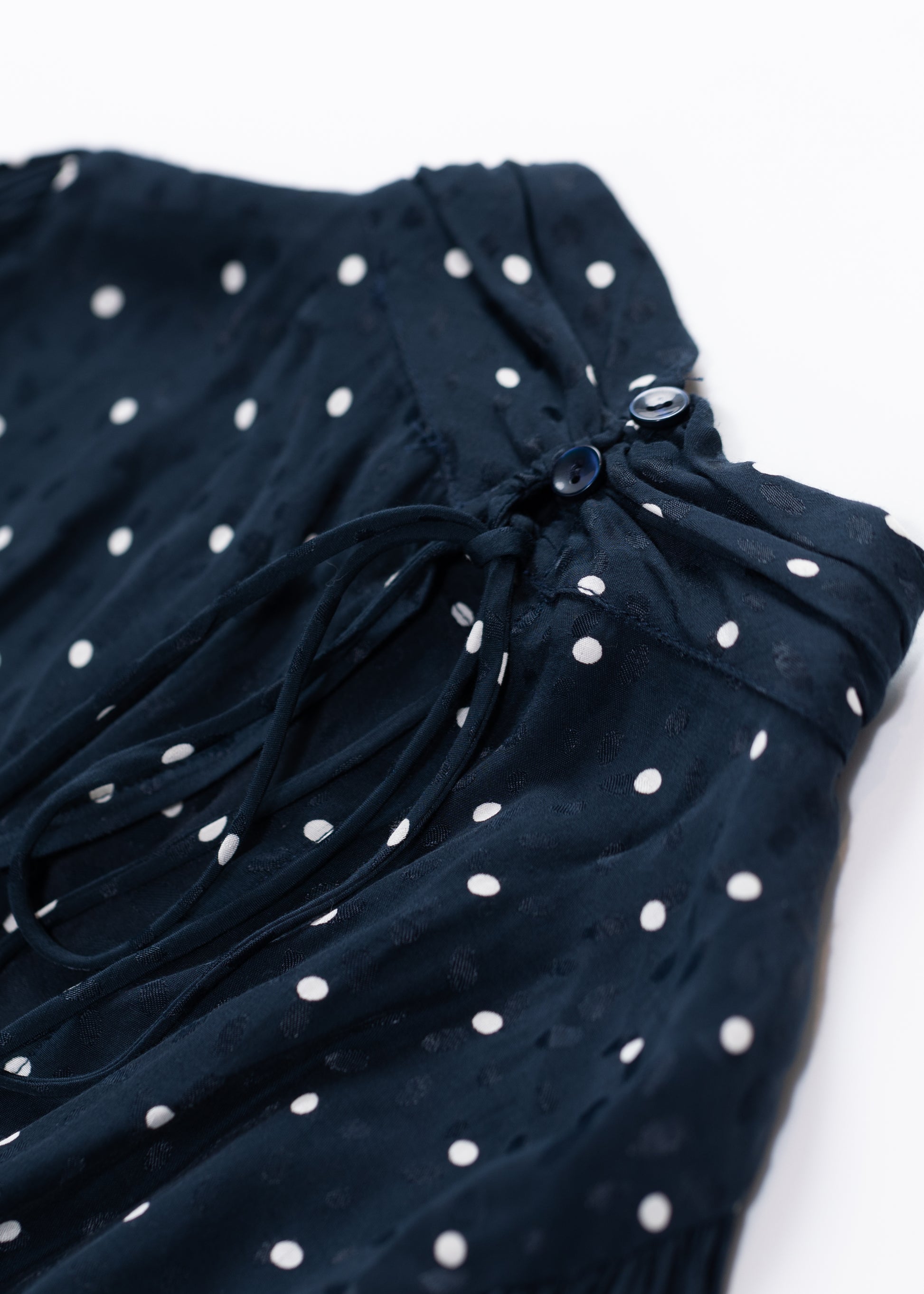 Elegant long blouse in a white tiny dot pattern on navy fabric with a wide back opening and a gathered ruffle waist design.