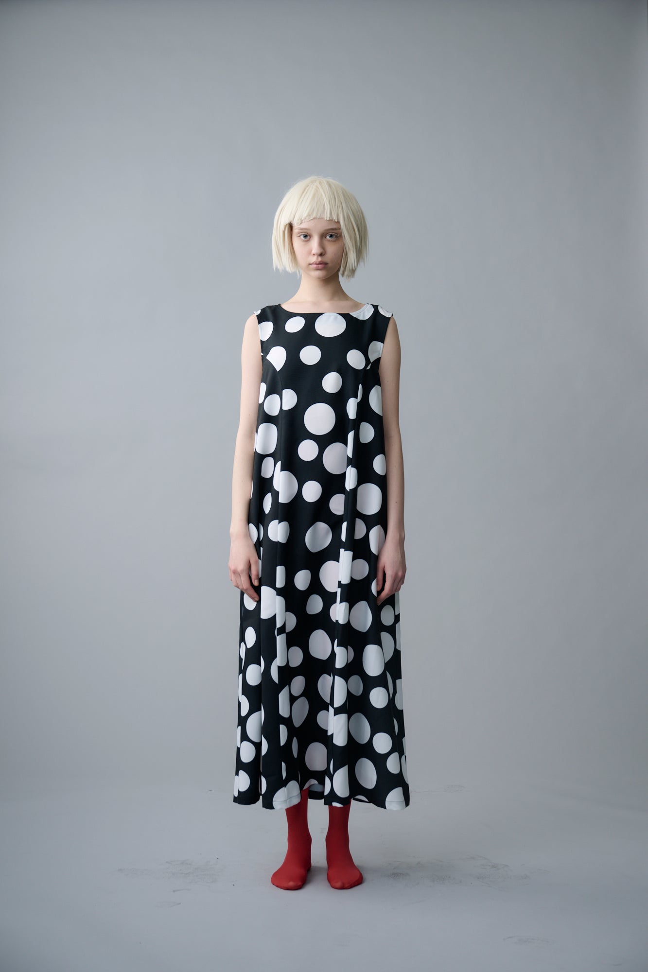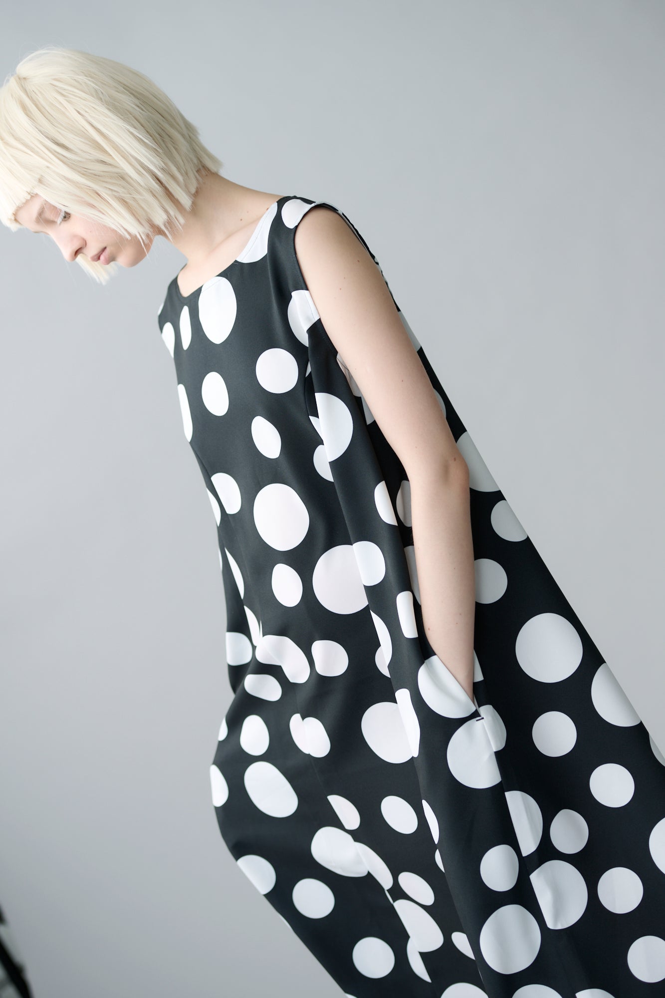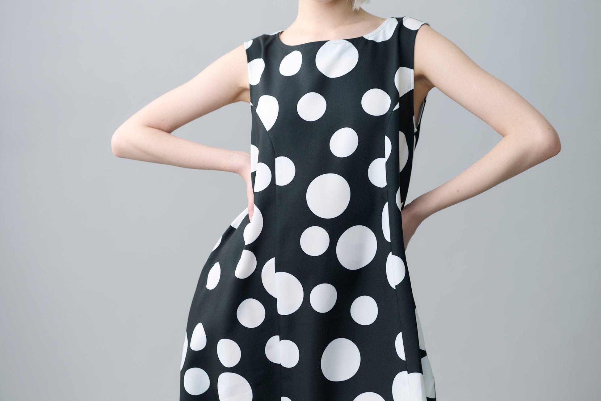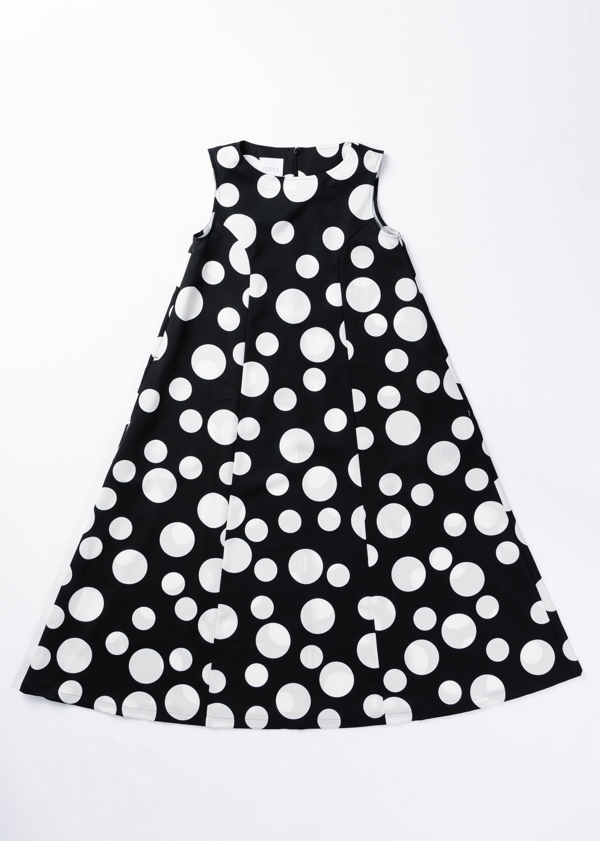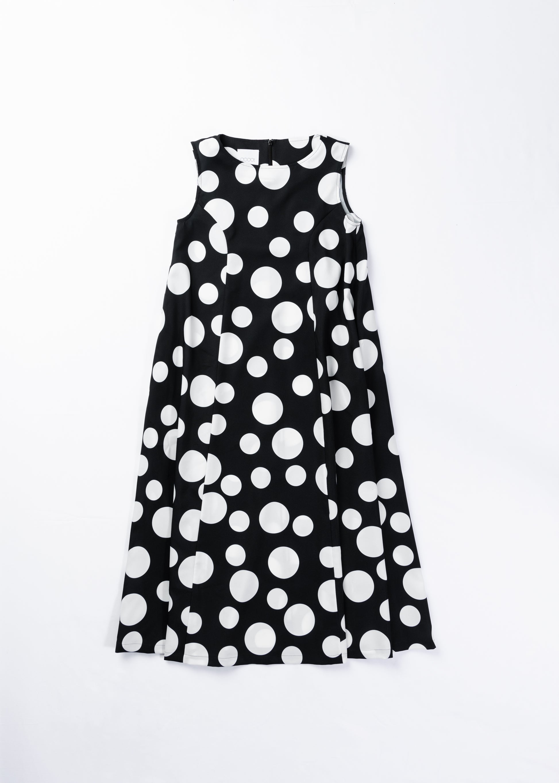 φ3inchとφ2inchのドットを組み合わせたオリジナルドット柄のプリントワンピース。1枚でも着やすいシルエットになるよう、デコルテを美しく見せる首周り、すっきりとした脇下のラインにこだわったデザインです。