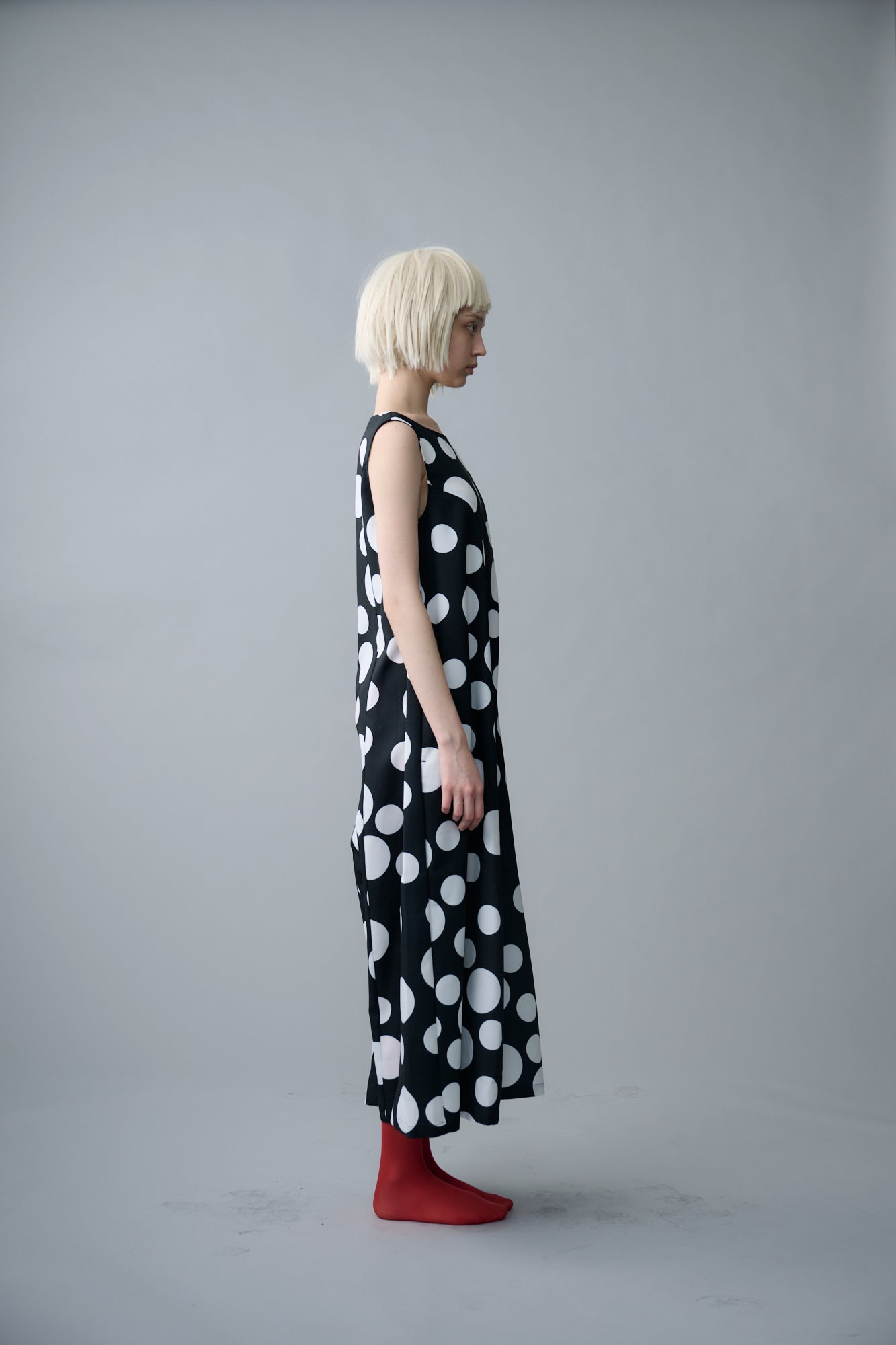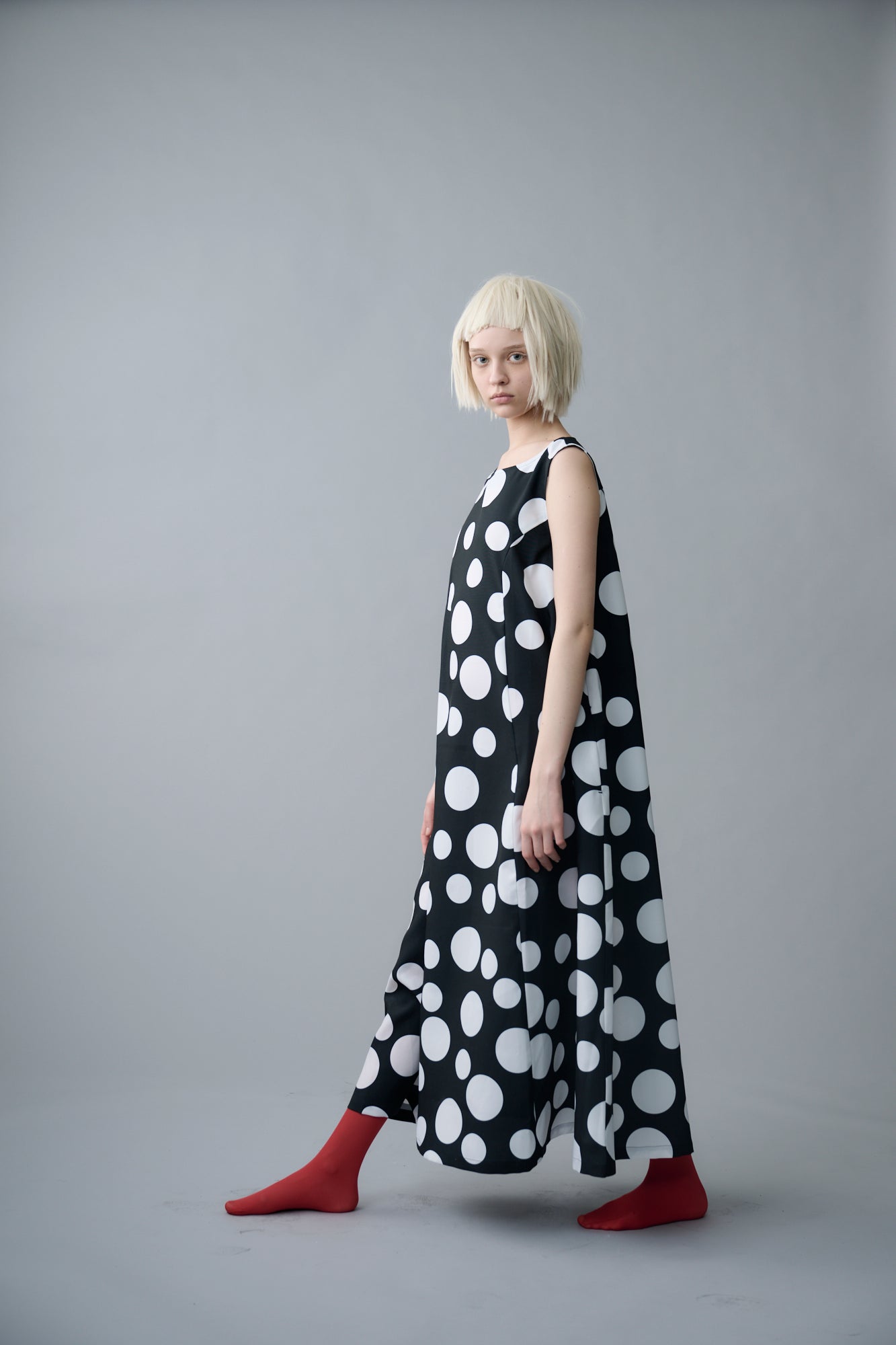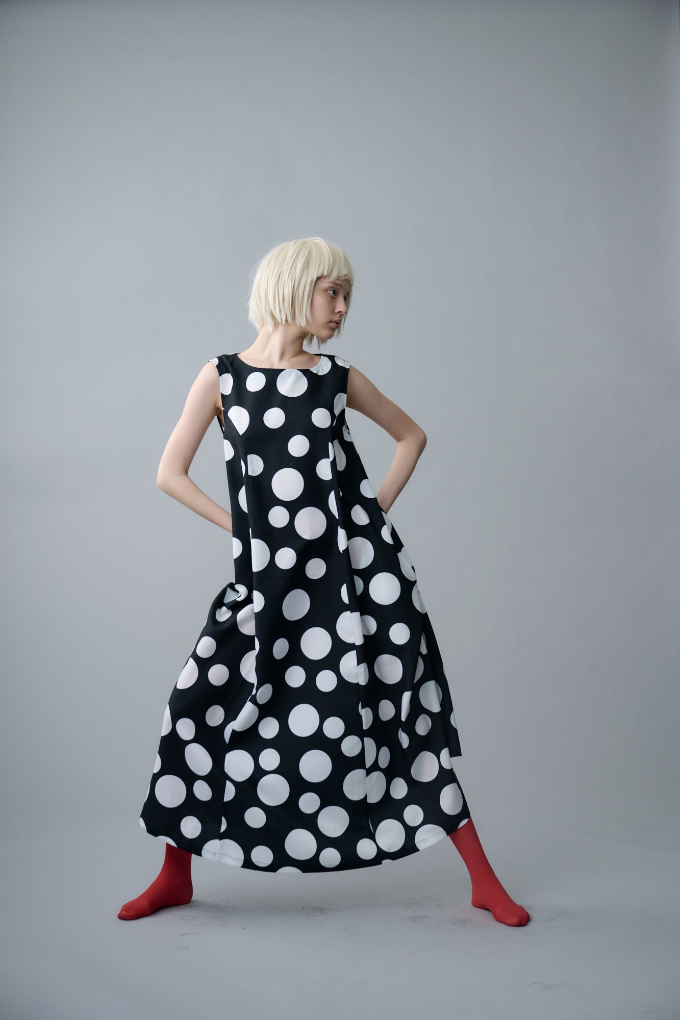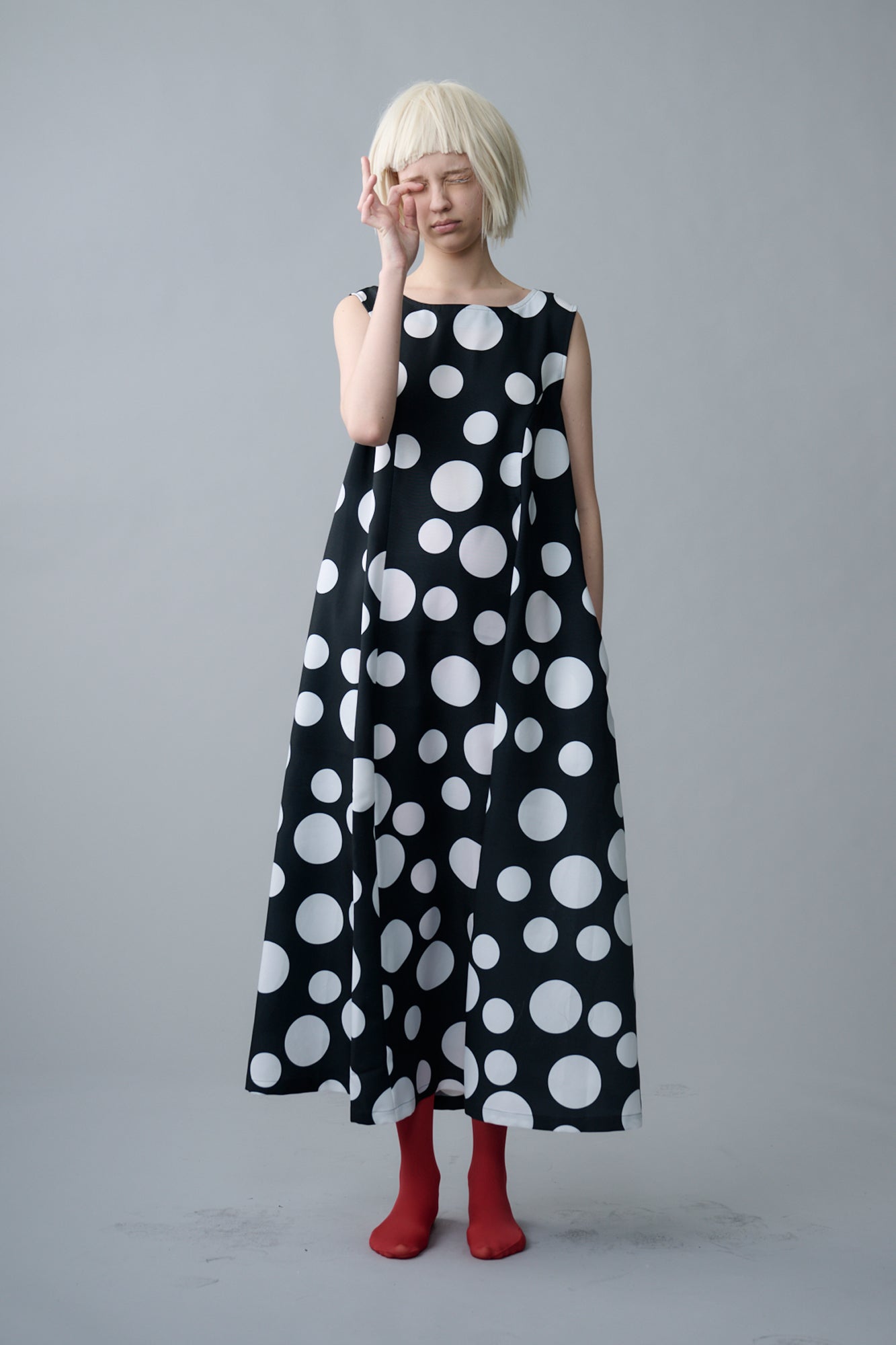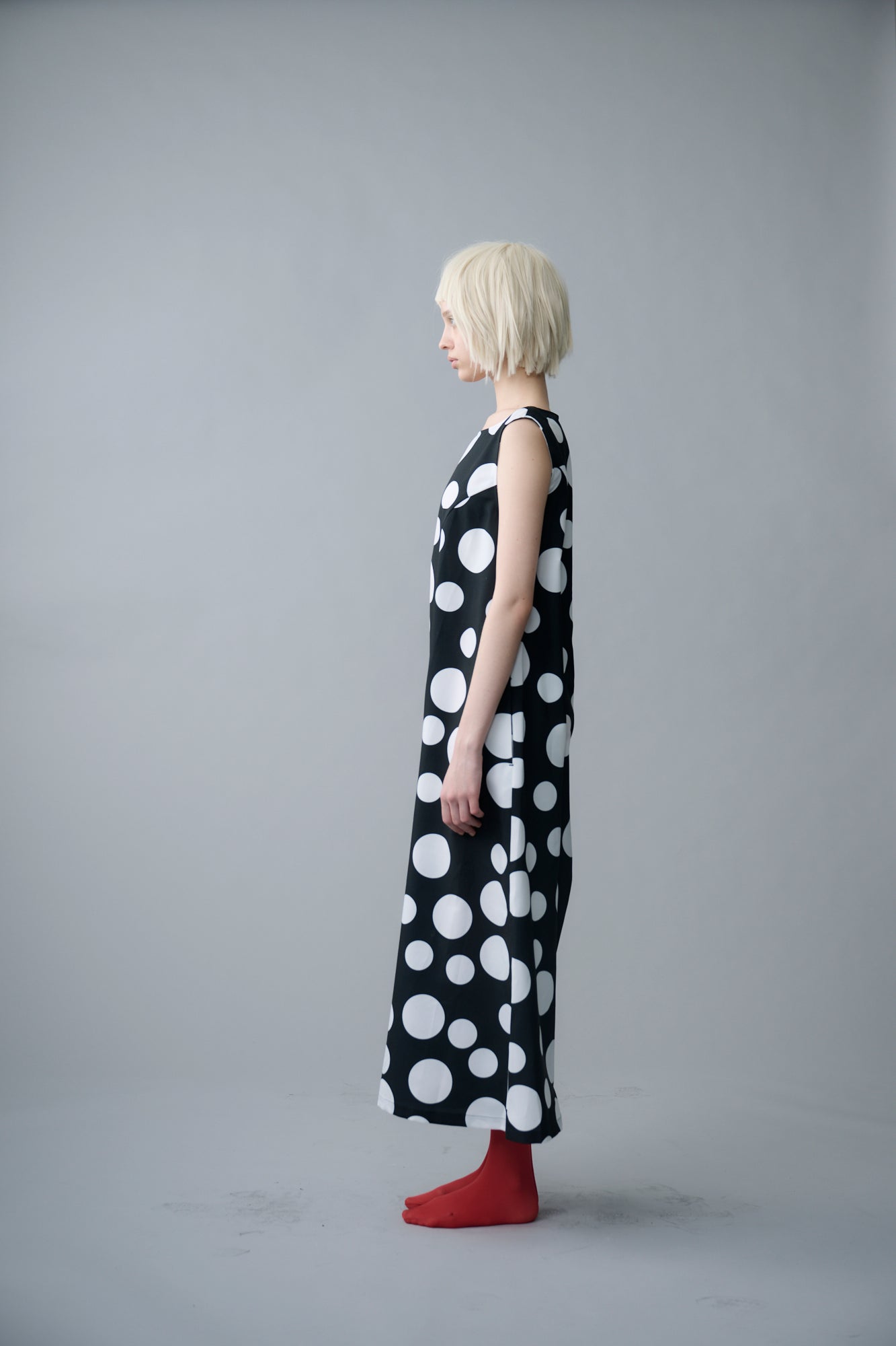 φ3inchとφ2inchのドットを組み合わせたオリジナルドット柄のプリントワンピース。1枚でも着やすいシルエットになるよう、デコルテを美しく見せる首周り、すっきりとした脇下のラインにこだわったデザインです。