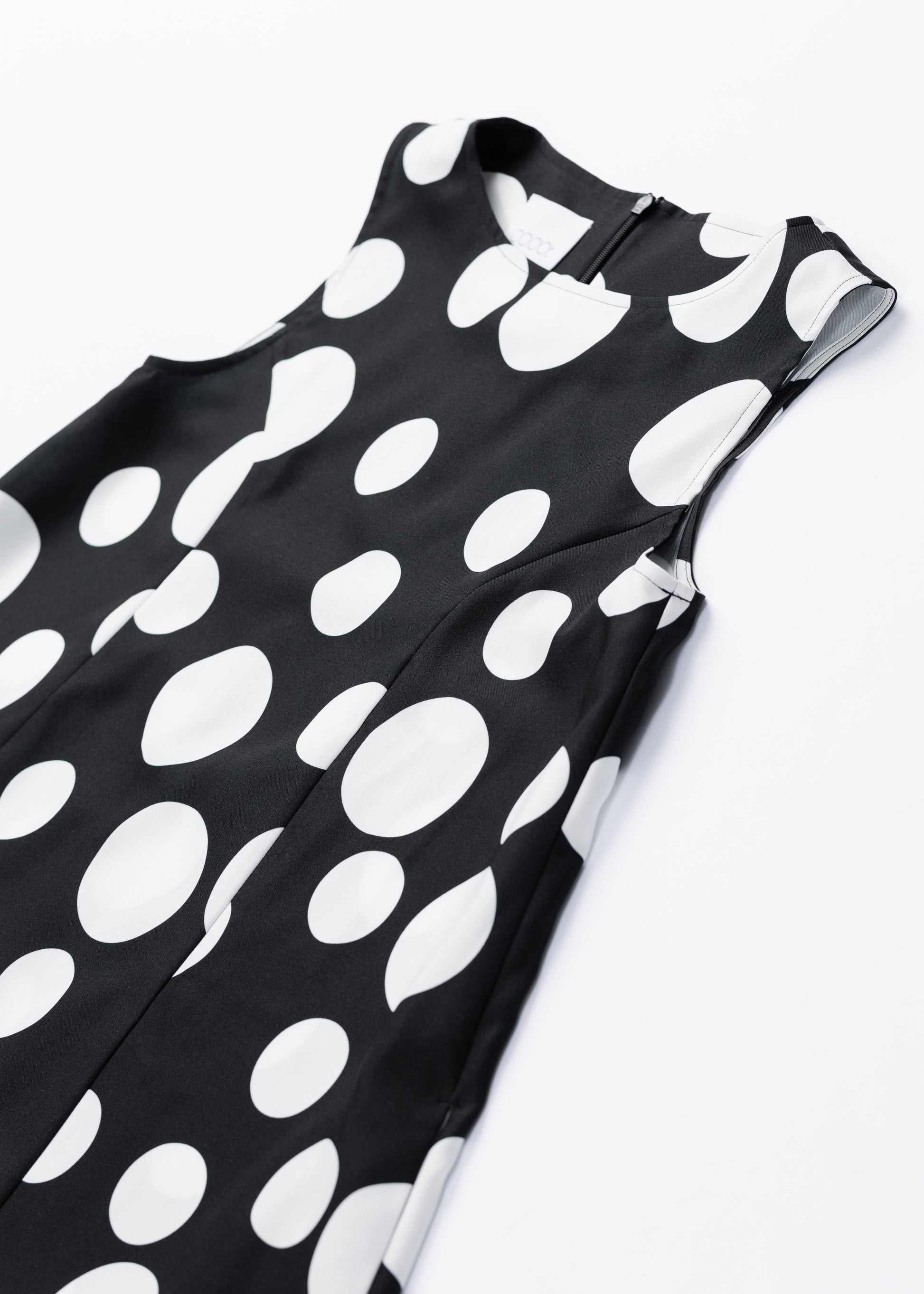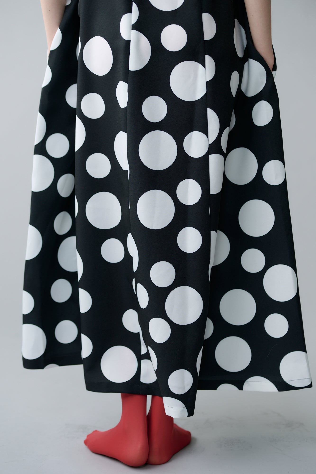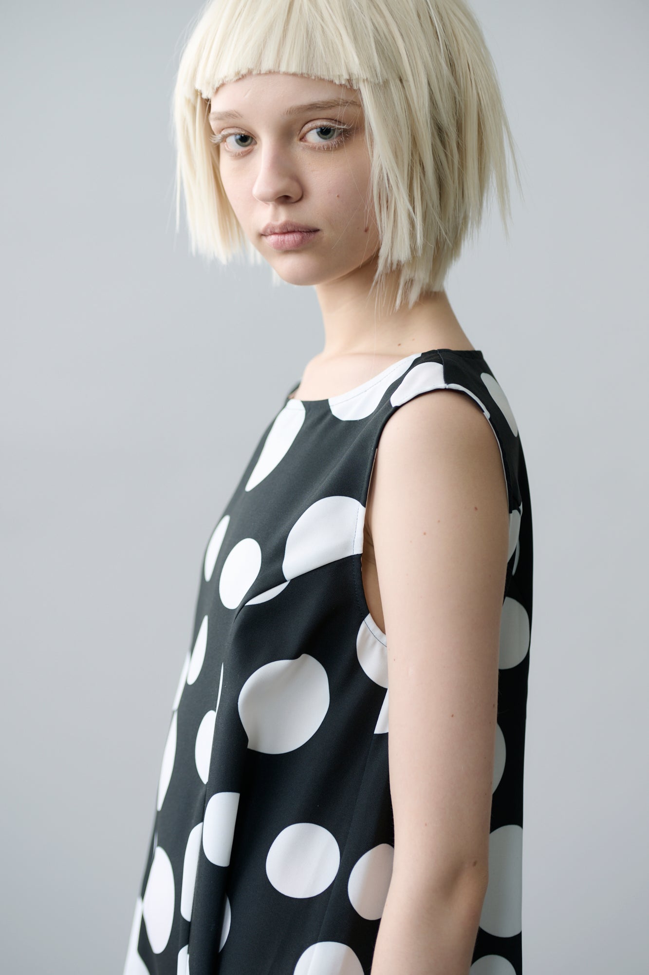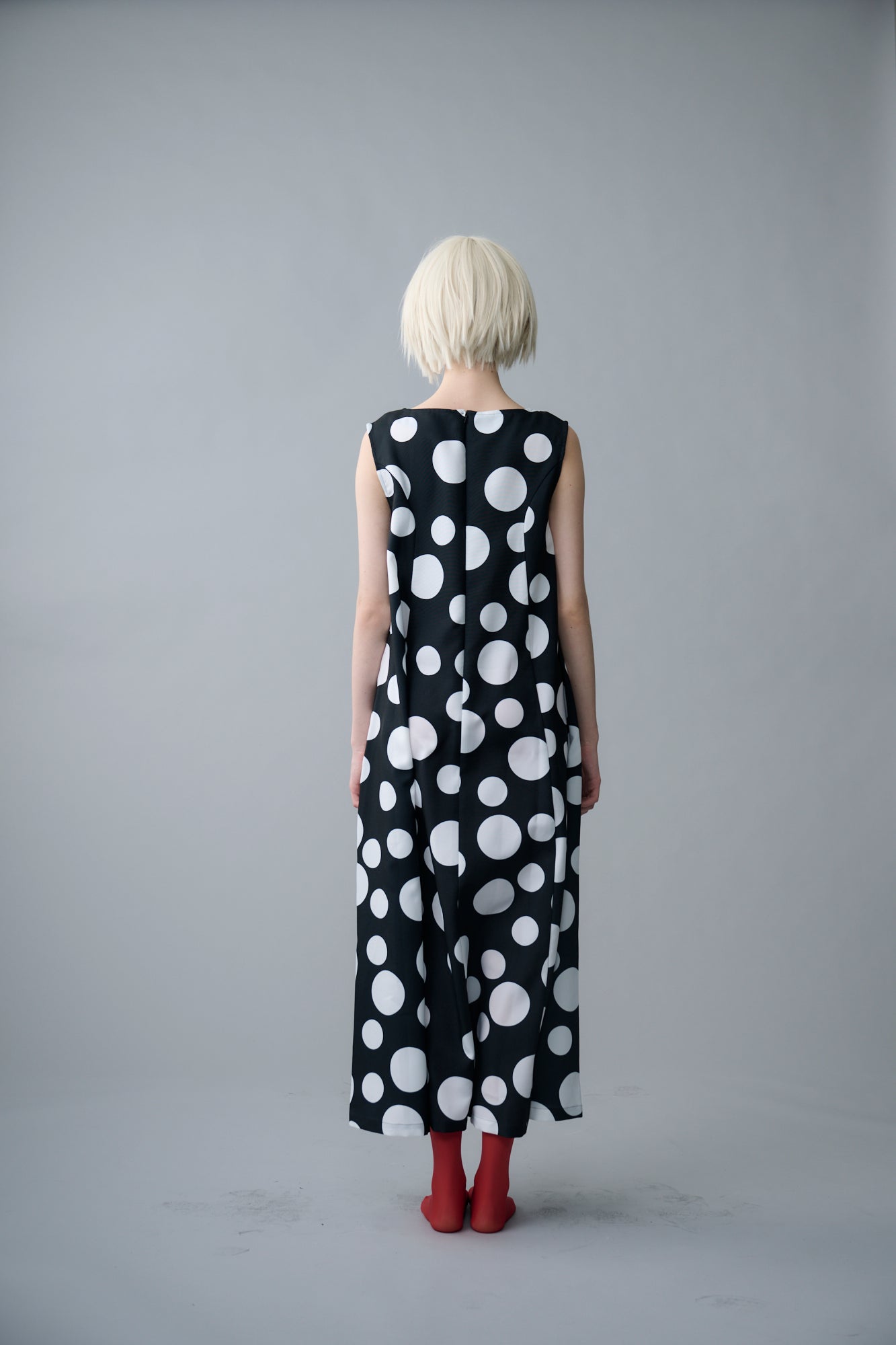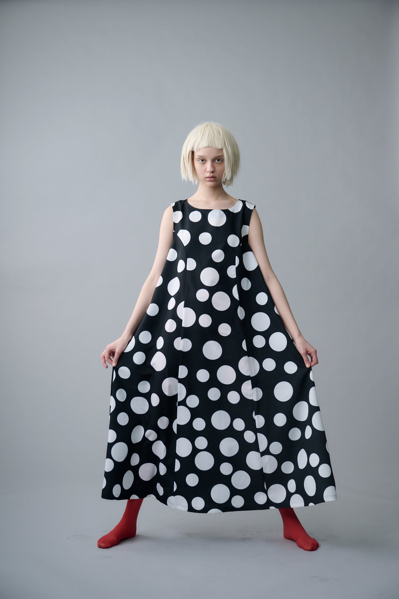 φ3inchとφ2inchのドットを組み合わせたオリジナルドット柄のプリントワンピース。1枚でも着やすいシルエットになるよう、デコルテを美しく見せる首周り、すっきりとした脇下のラインにこだわったデザインです。