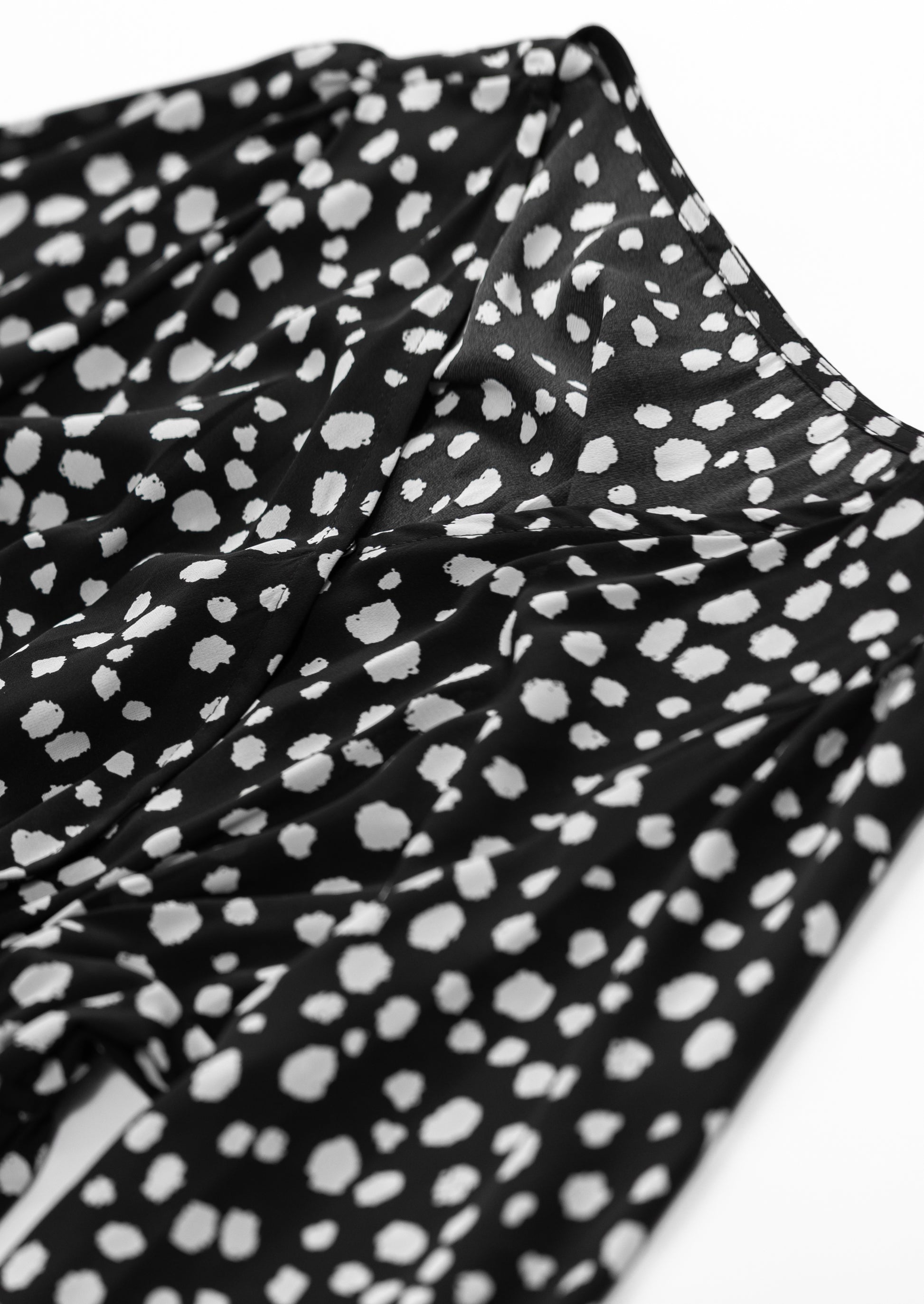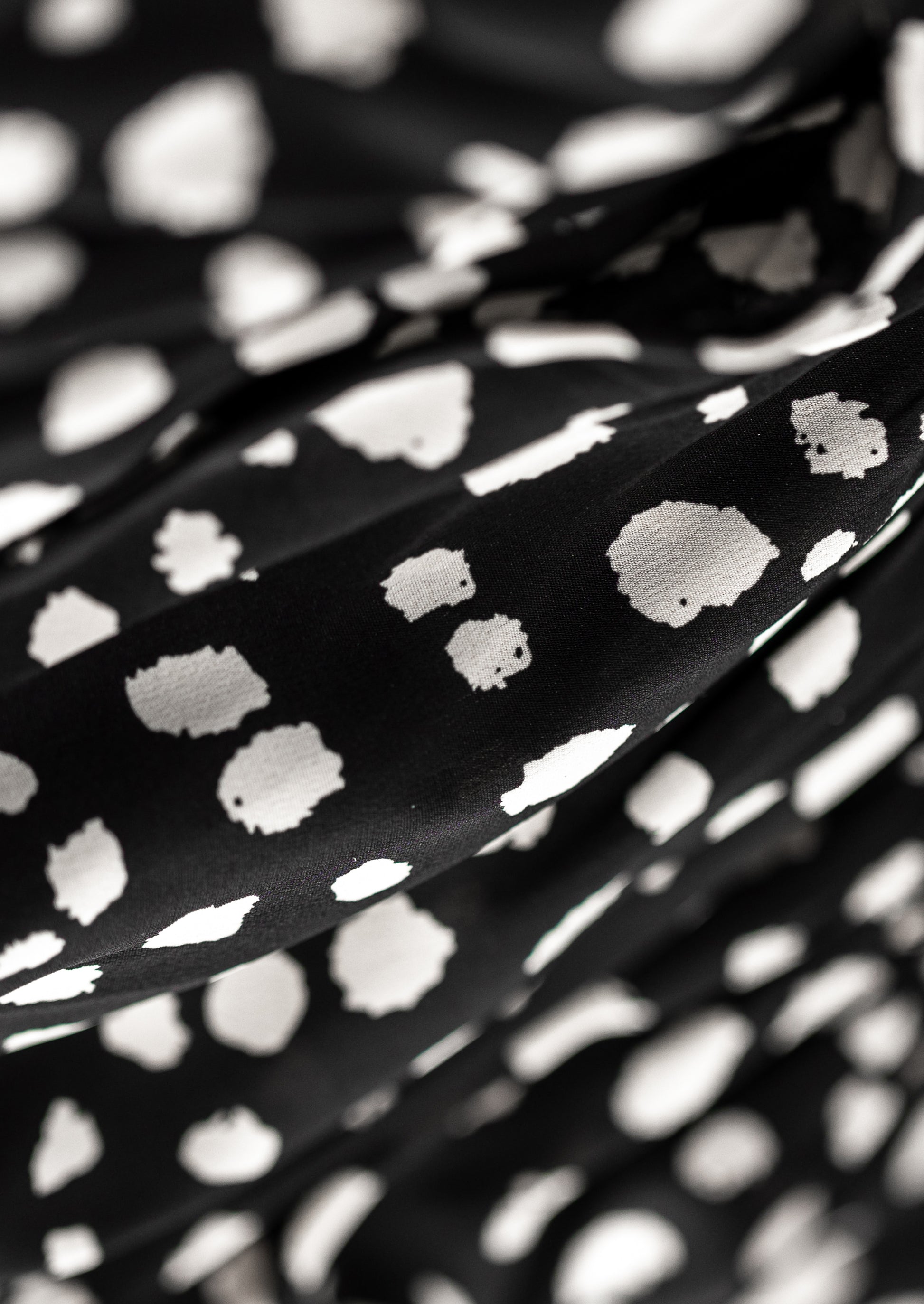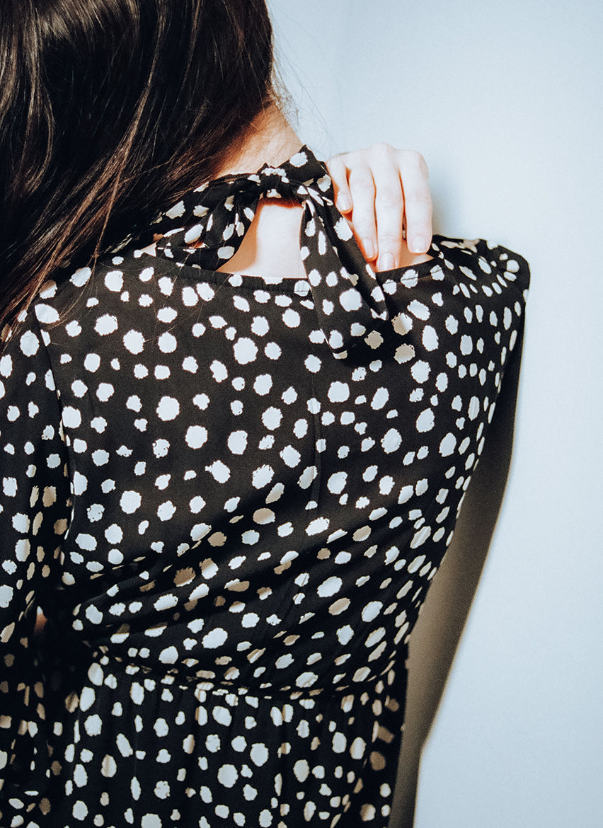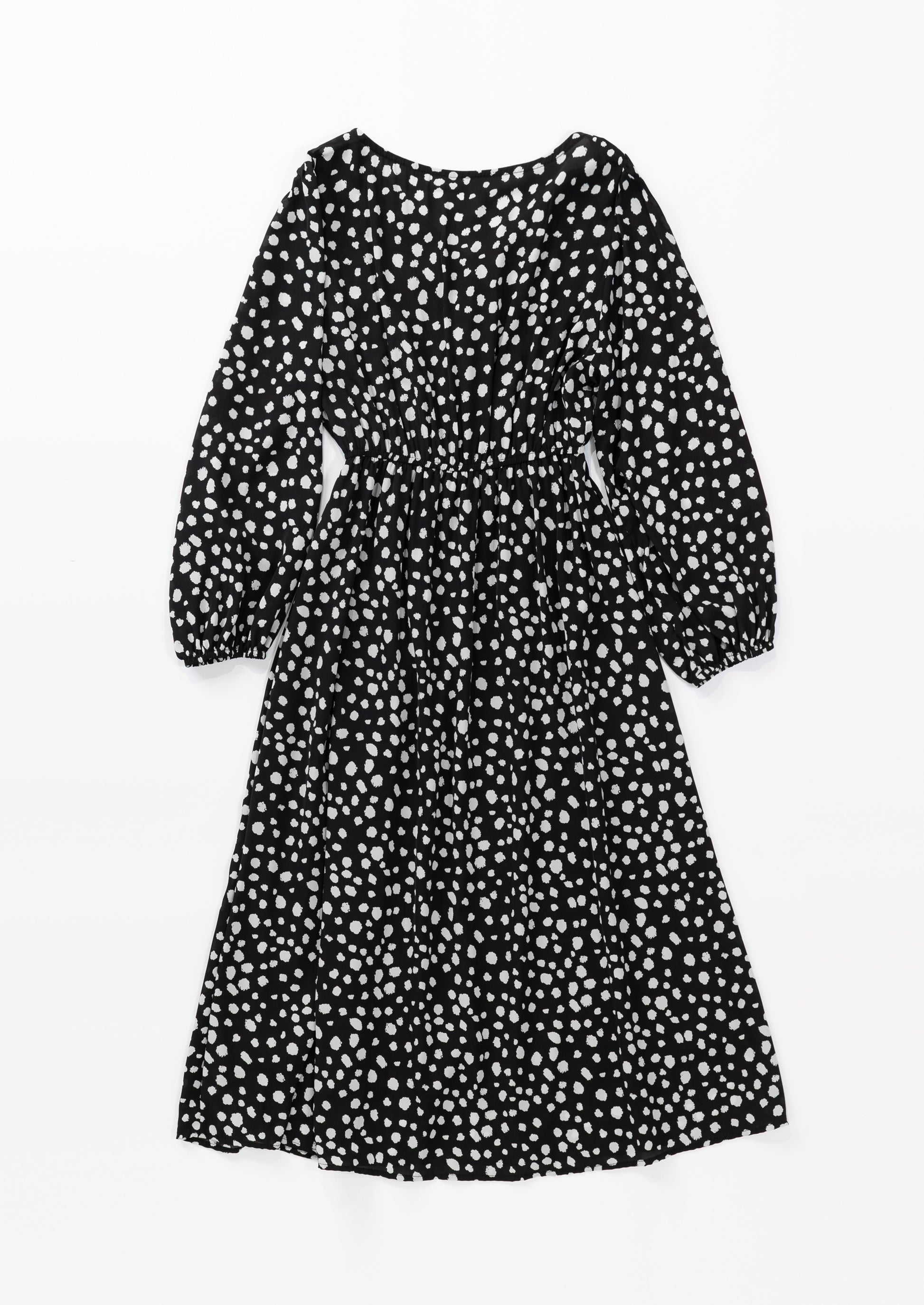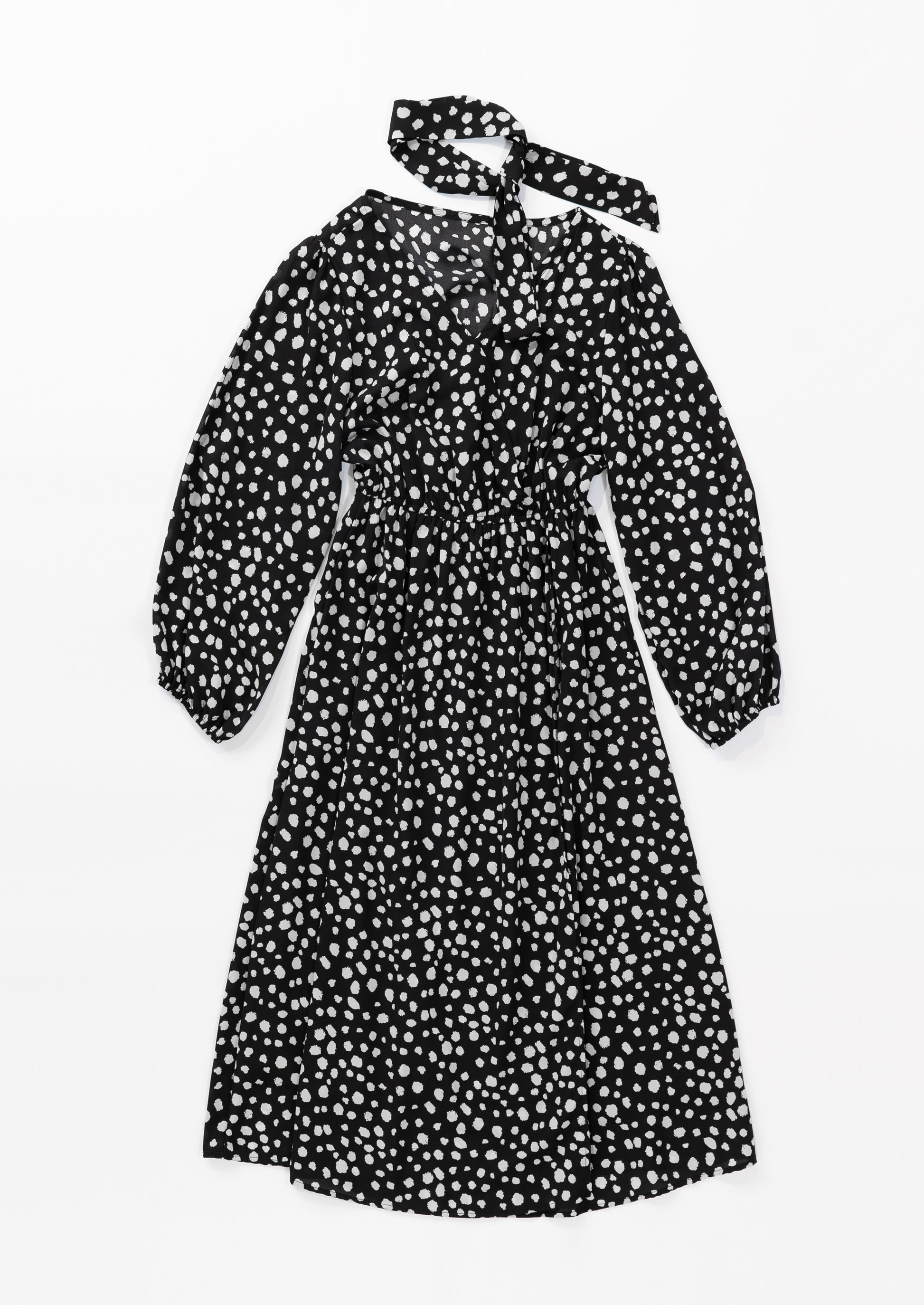 アニマル柄に近いドット柄で、サラッとした生地感で、1枚で上品に着こなせるワンピースです。