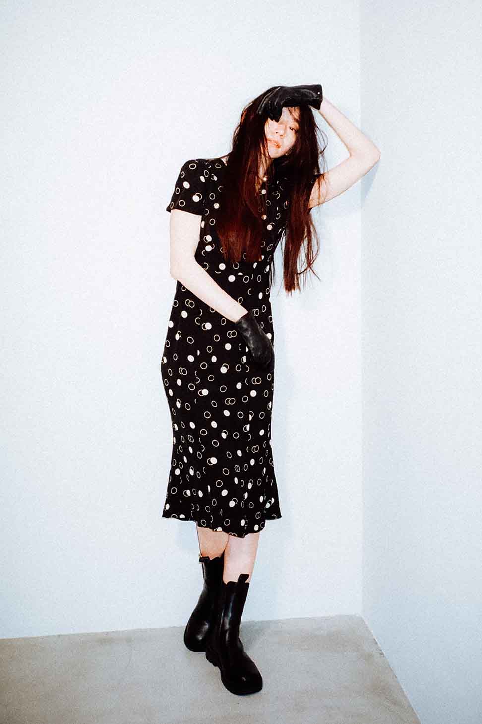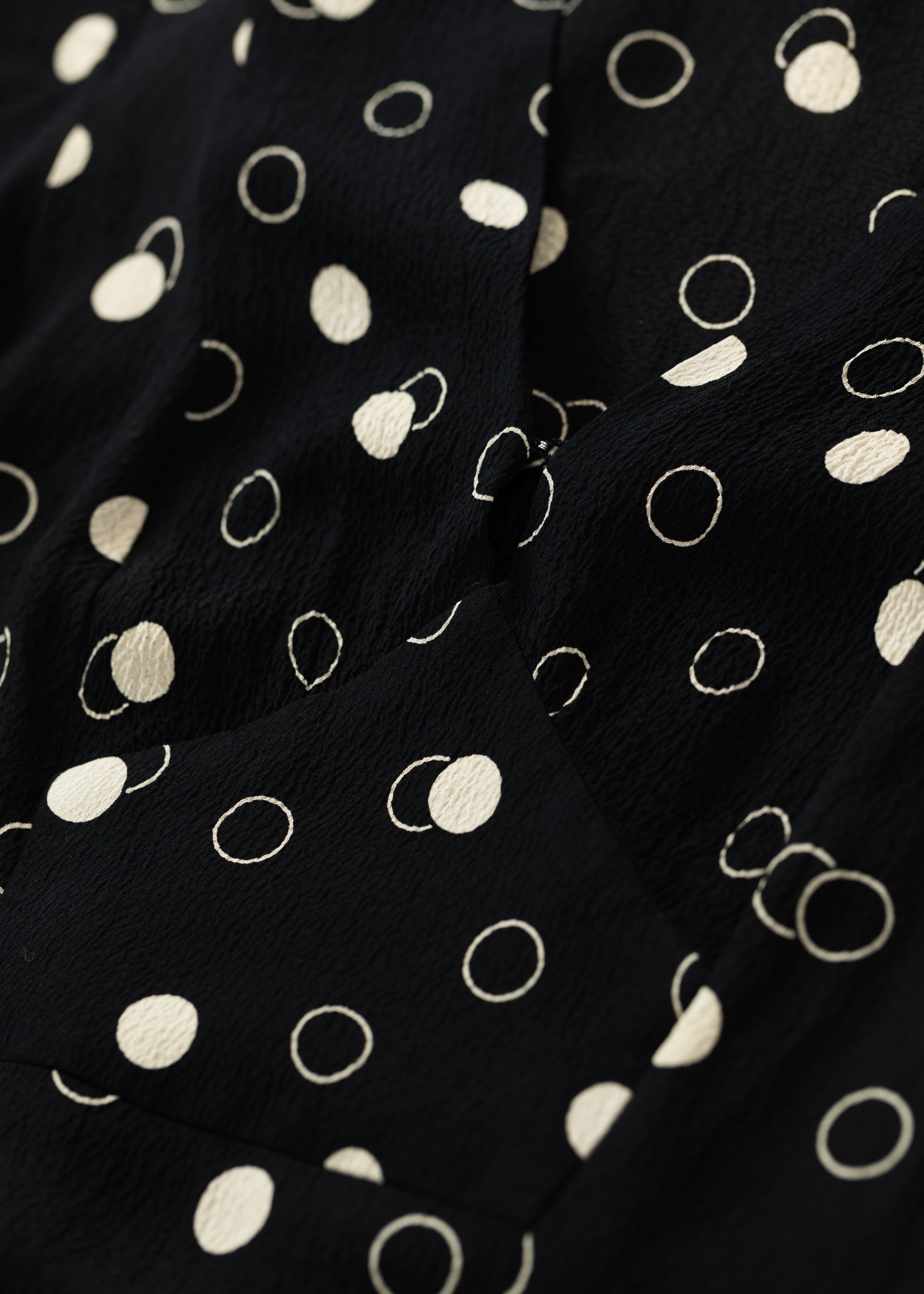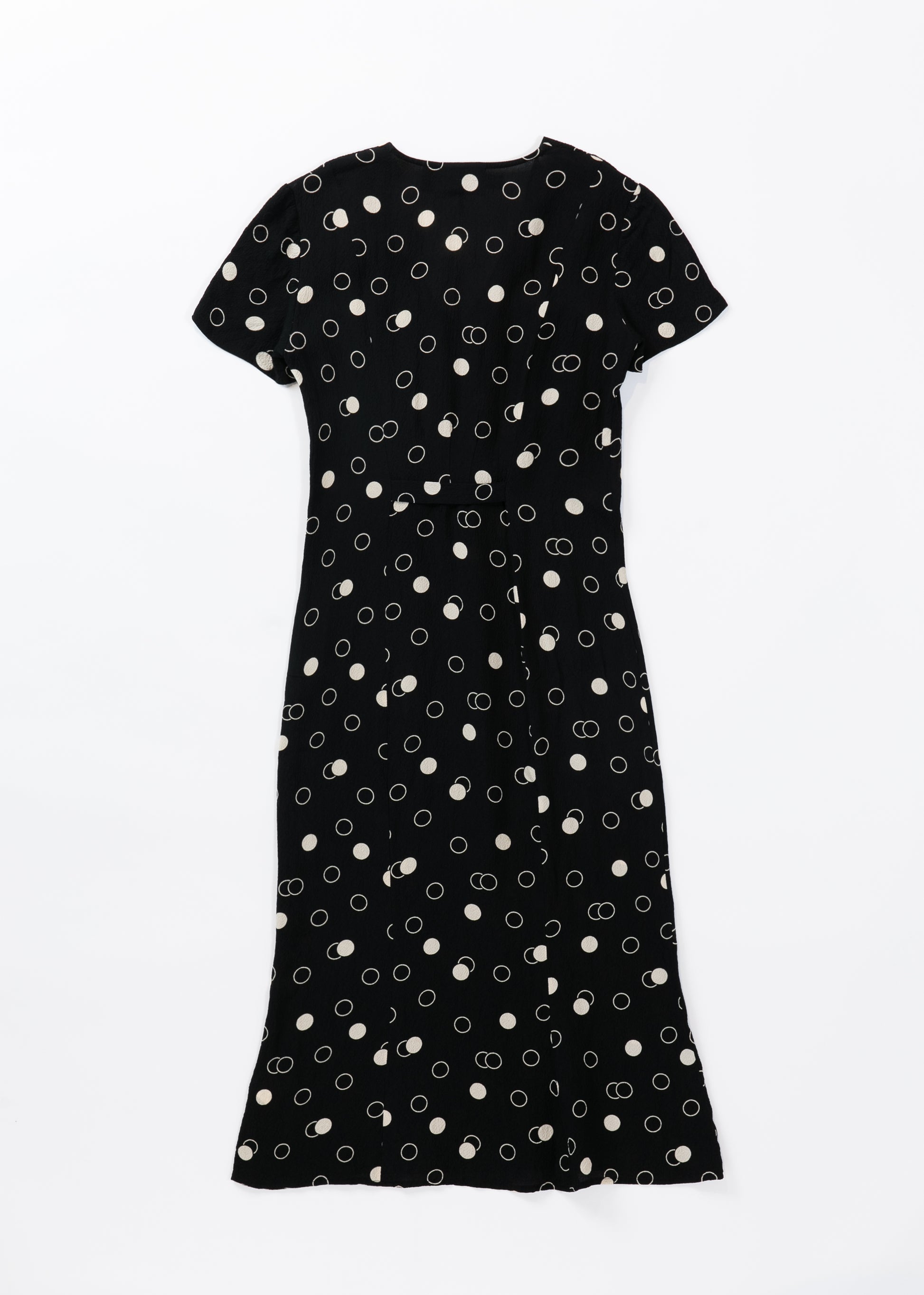 中程度のドットに丸いリングのようなデザインを合わせた、幾何学ドット柄のVネックロングワンピースです。