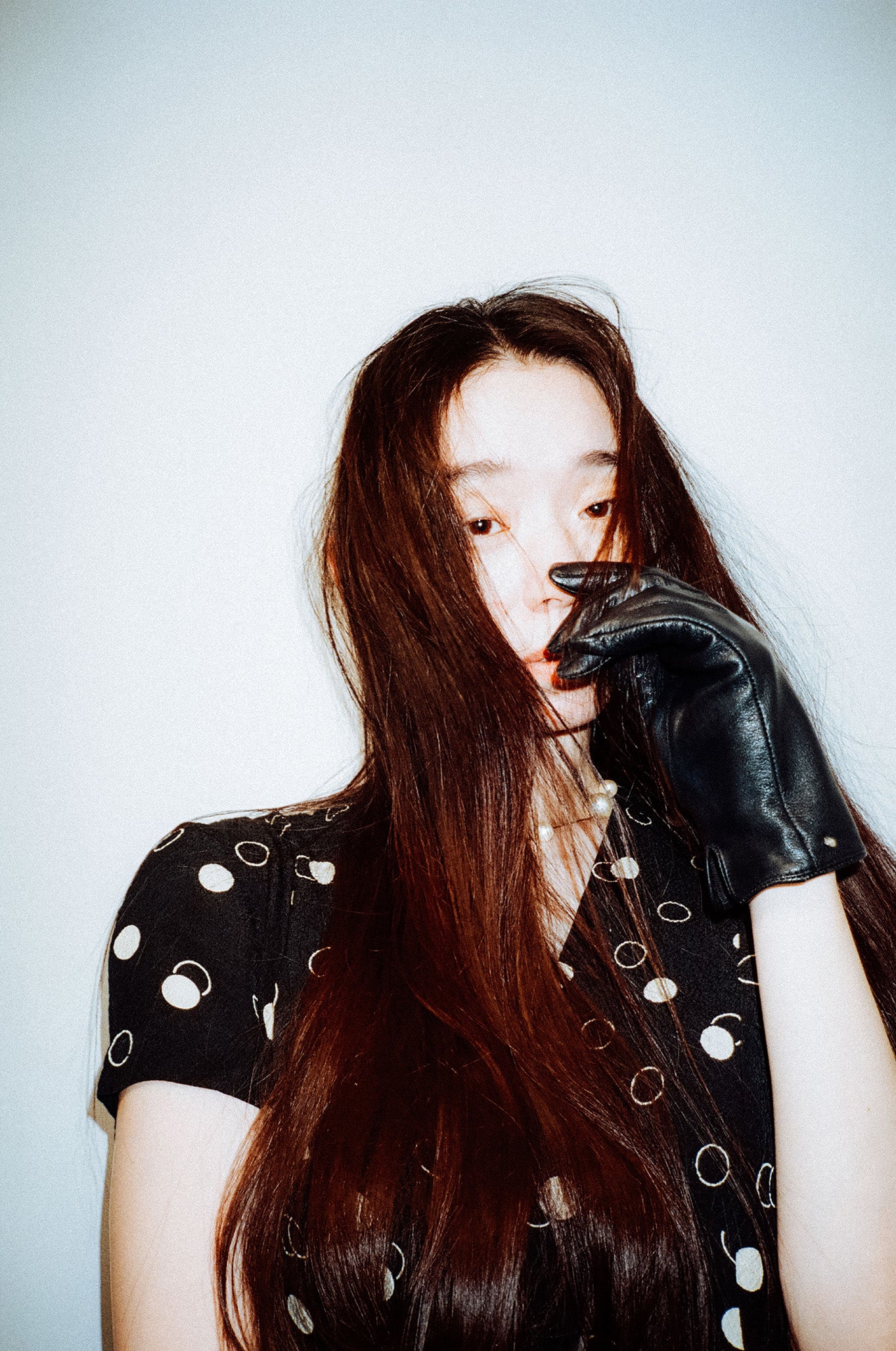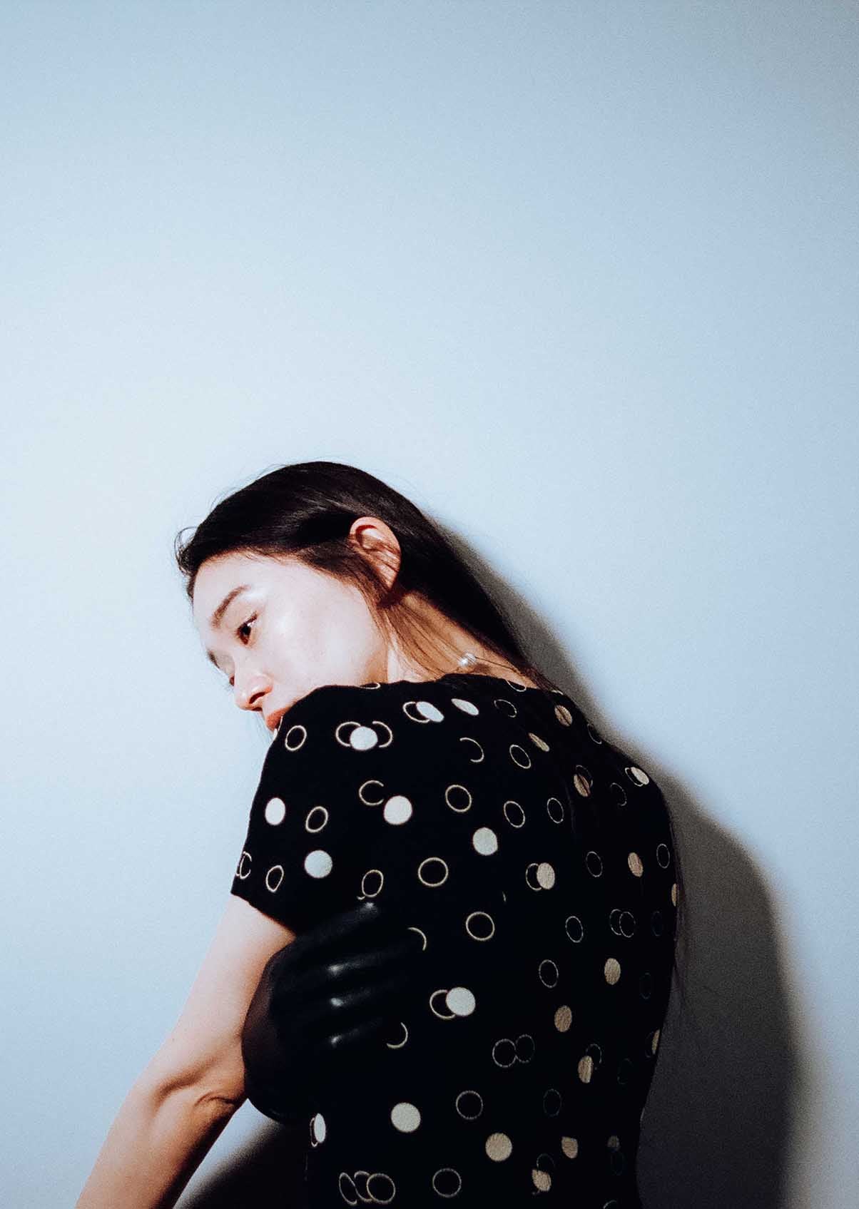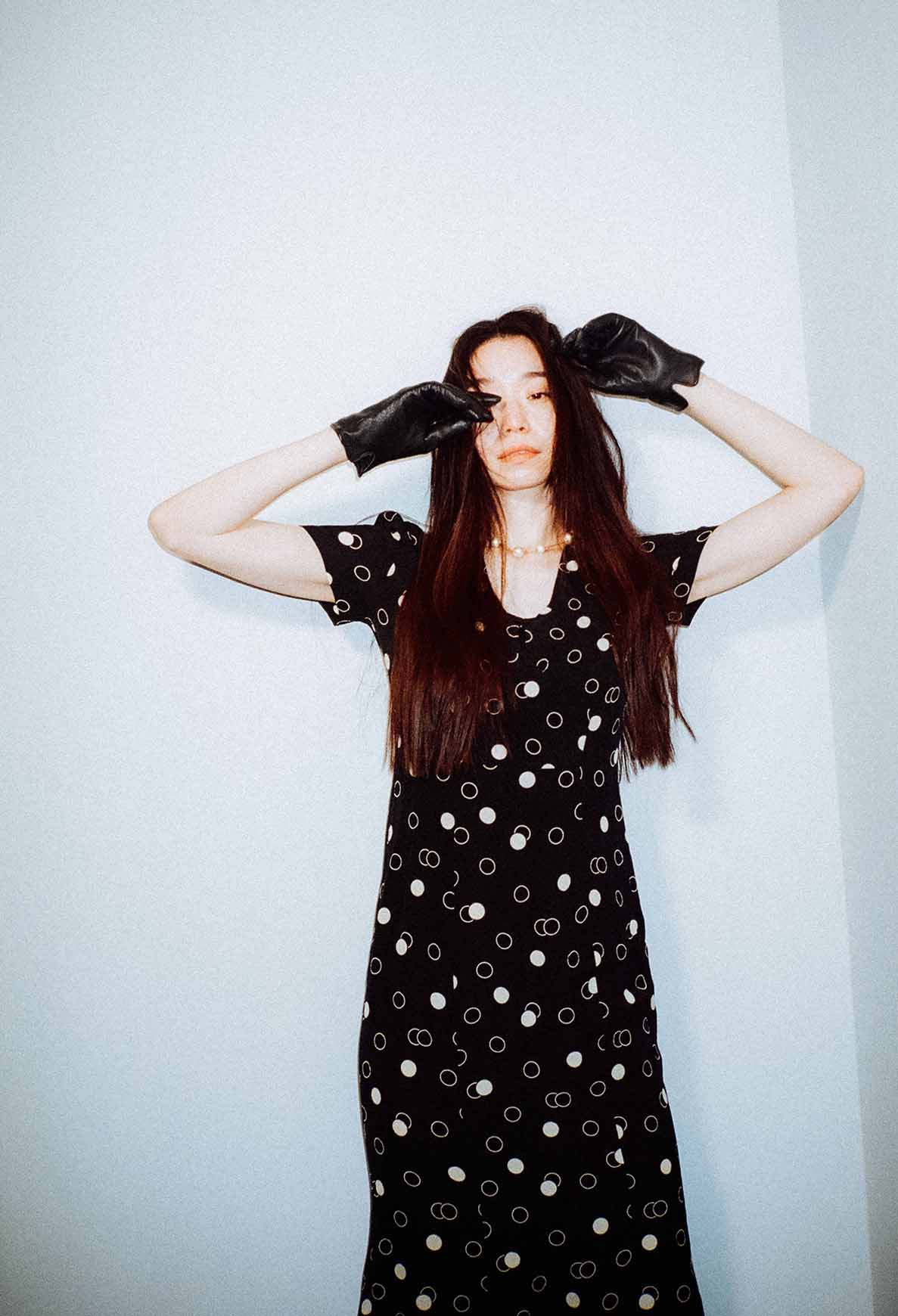 中程度のドットに丸いリングのようなデザインを合わせた、幾何学ドット柄のVネックロングワンピースです。