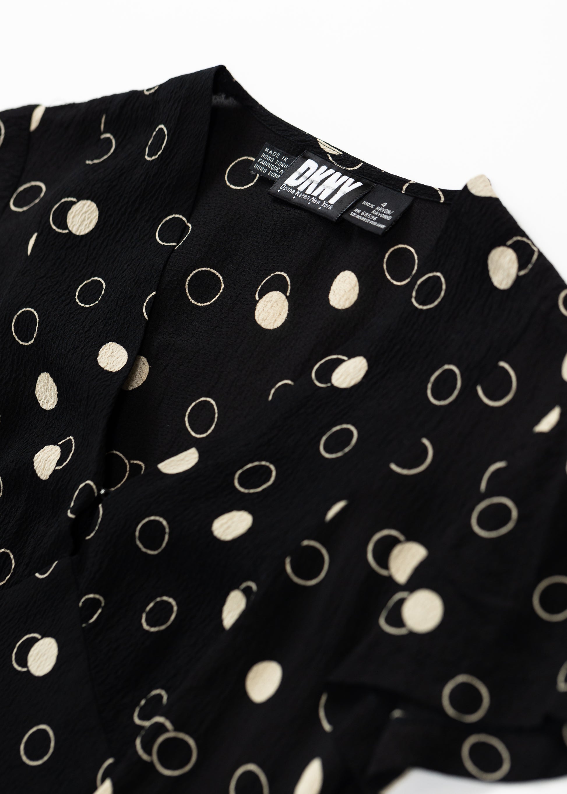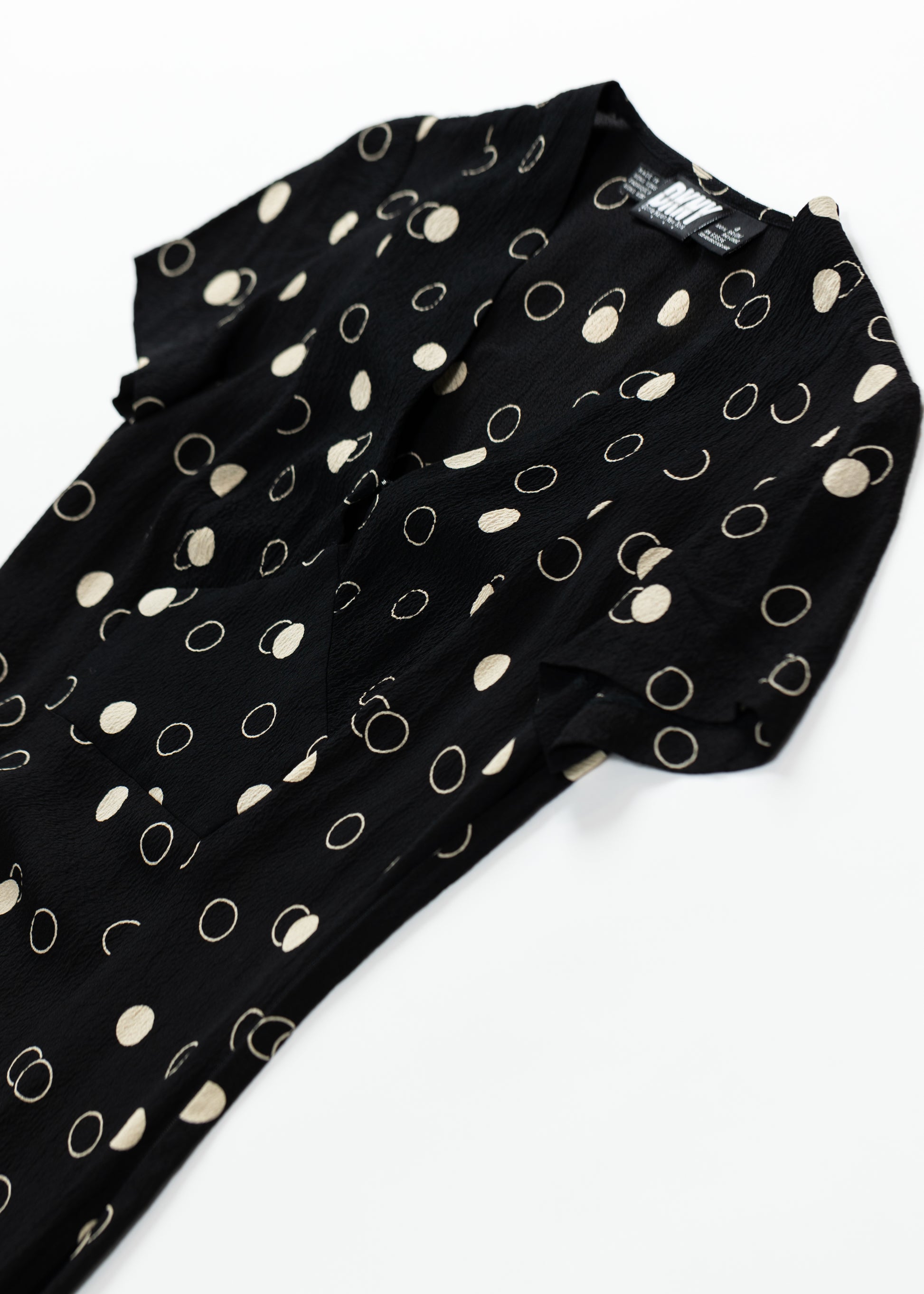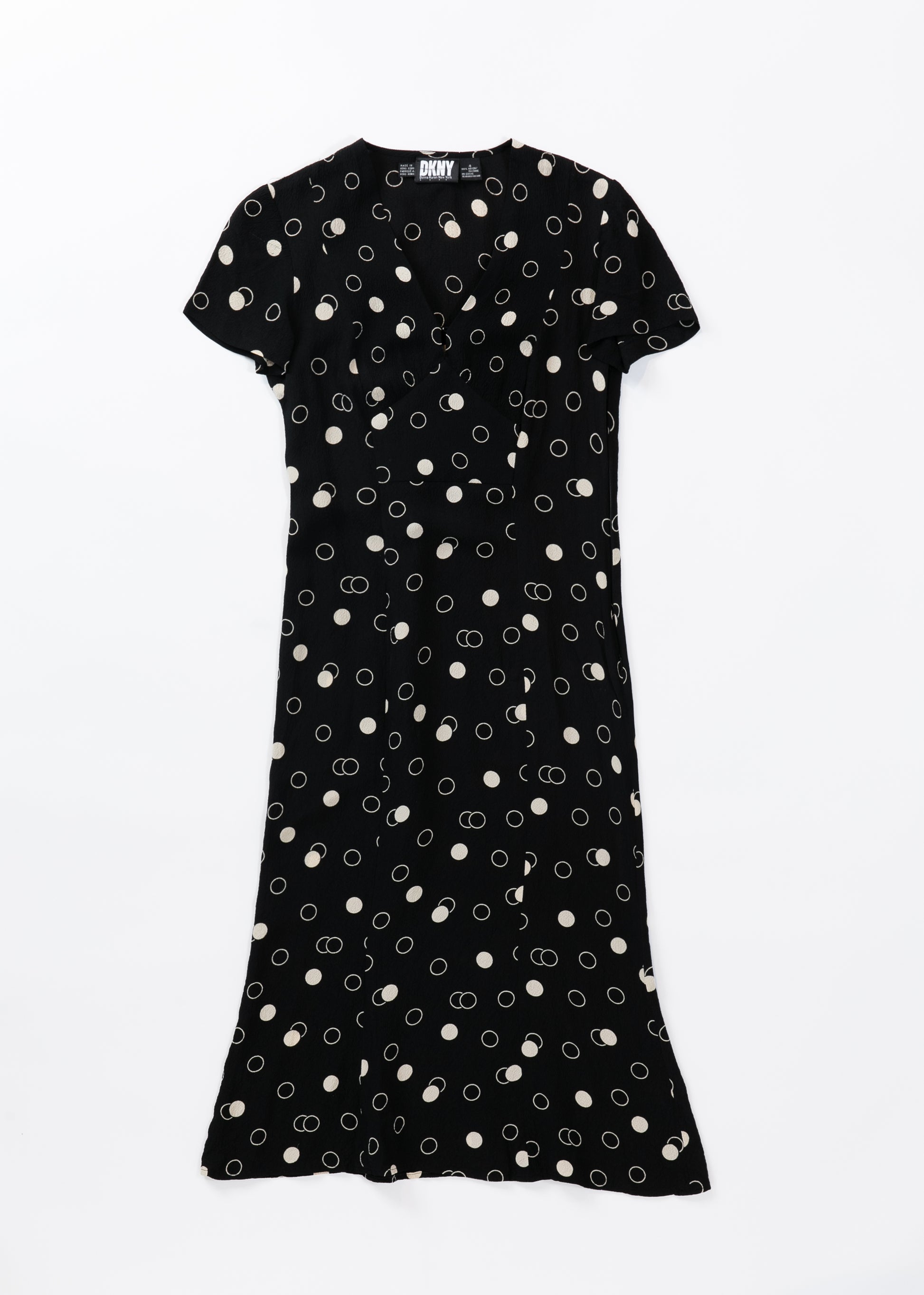 V-neck long dress with a geometric dot pattern, combining dots with a round ring-like design.