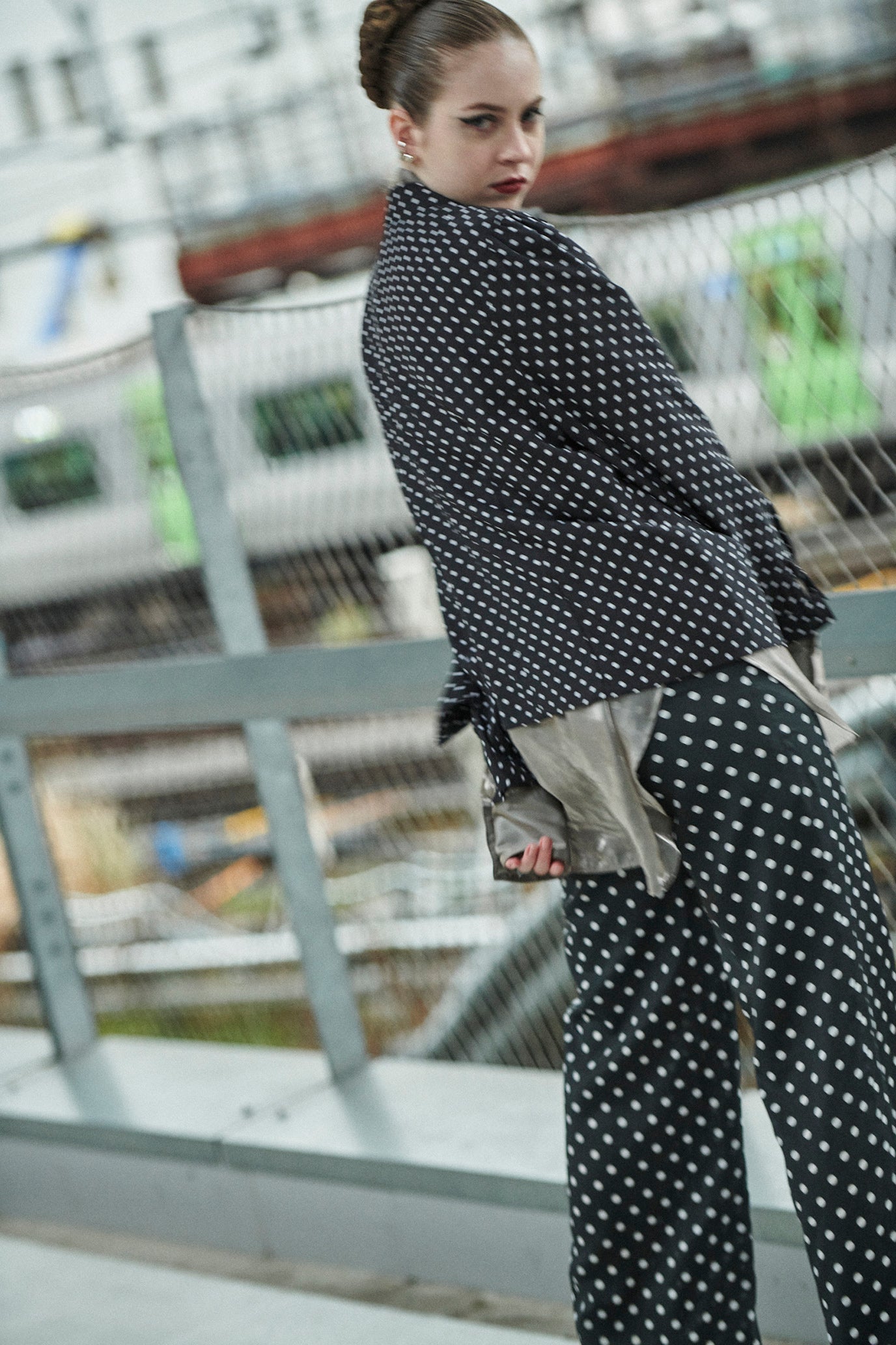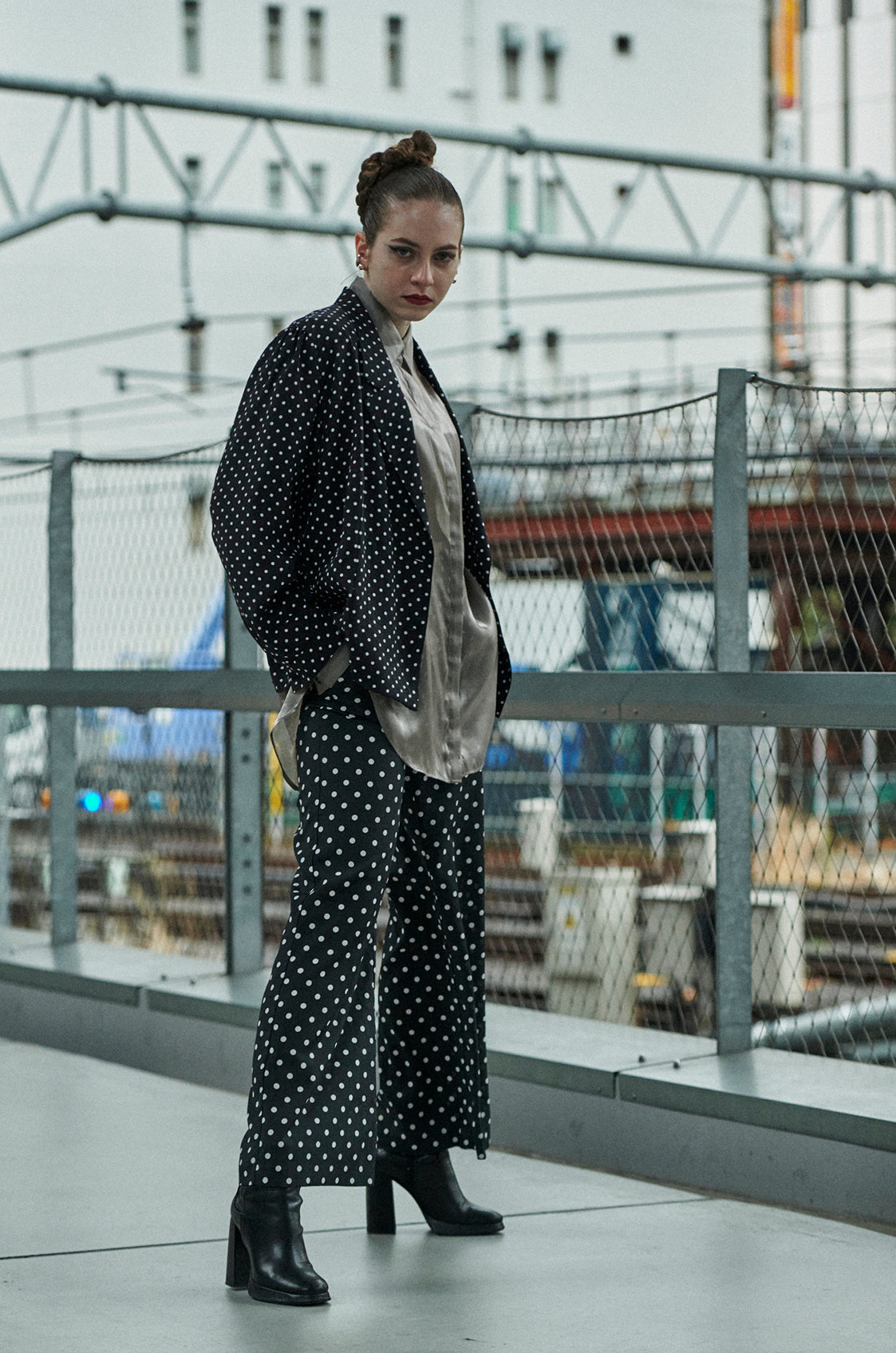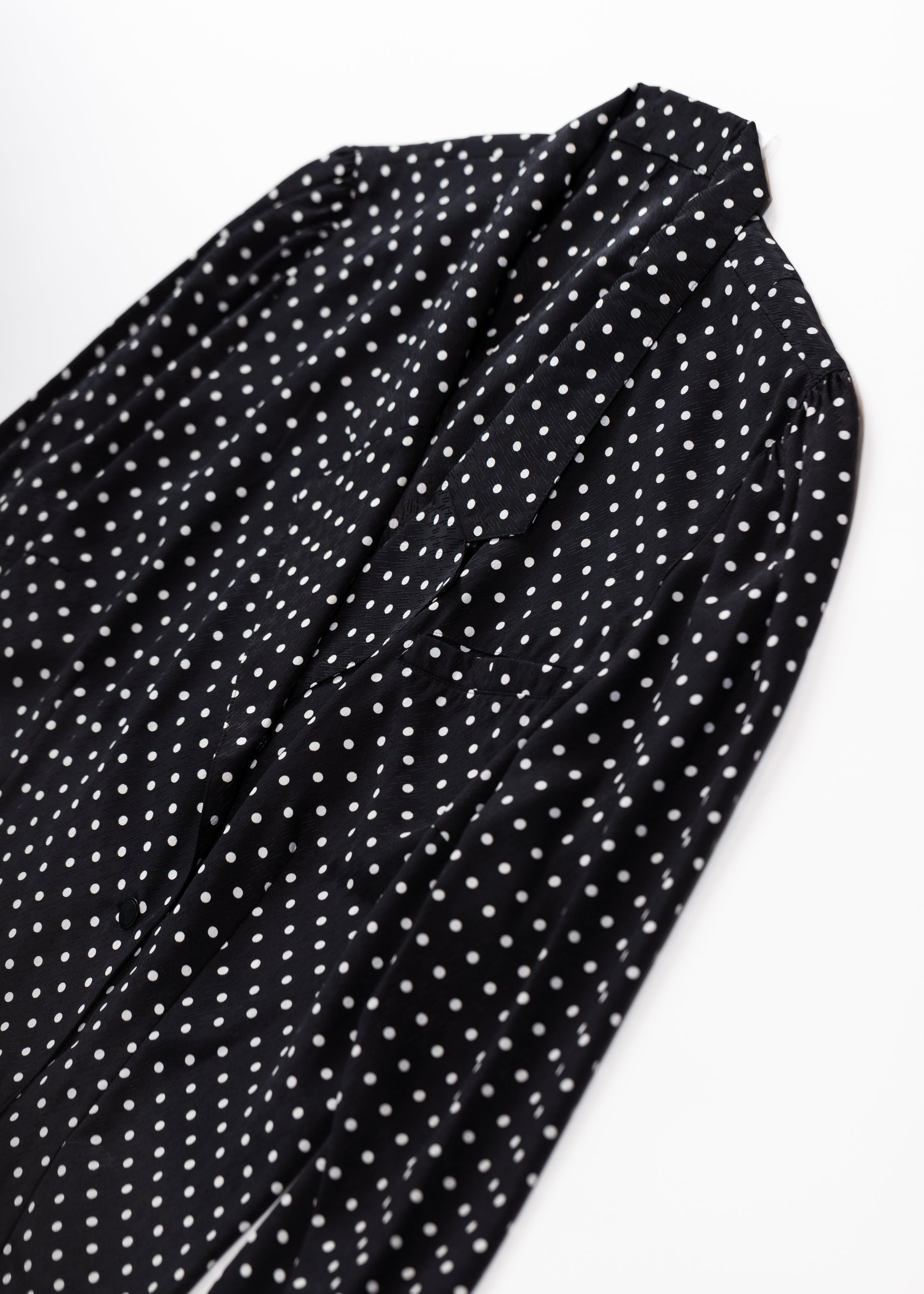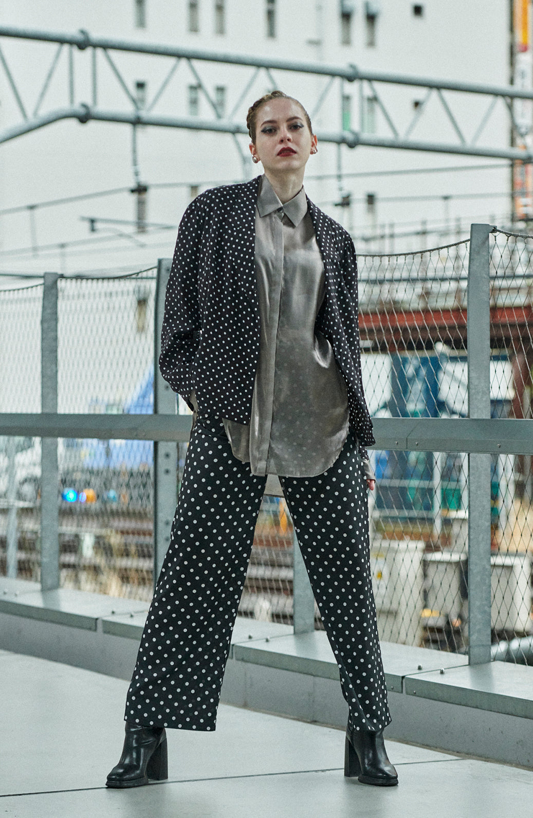 小さなドット柄で、さらりとした生地感でゆったりとした着心地のシングルボタンジャケットです。